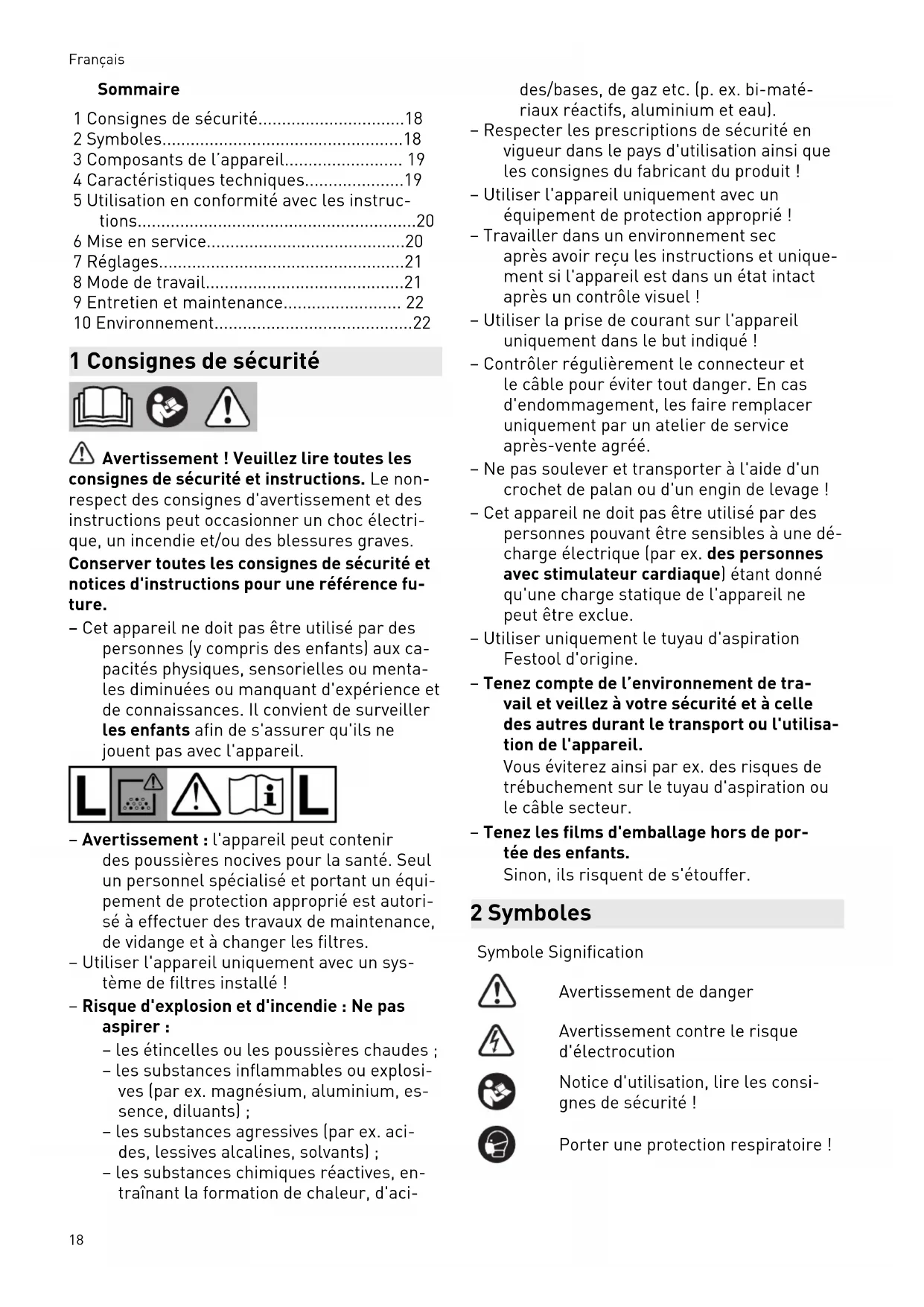 - 10 Environnement 1 Consignes de sécurité Avertissement ! Veuillez lire toutes les consignes de sécurité et instructions. Le non- respect des consignes d'avertissement et des instructions peut occasionner un choc électri que, un incendie et/ou des blessures graves. Conserver toutes les consignes de sécurité et notices d'instructions pour une référence fu ture. – Cet appareil ne doit pas être utilisé par des personnes (y compris des enfants) aux ca pacités physiques, sensorielles ou menta les diminuées ou manquant d'expérience et de connaissances. Il convient de surveiller les enfants afin de s'assurer qu'ils ne jouent pas avec l'appareil. – Avertissement : l'appareil peut contenir des poussières nocives pour la santé. Seul un personnel spécialisé et portant un équi pement de protection approprié est autori sé à effectuer des travaux de maintenance, de vidange et à changer les filtres. – Utiliser l'appareil uniquement avec un sys tème de filtres installé ! – Risque d'explosion et d'incendie : Ne pas aspirer : – les étincelles ou les poussières chaudes ; – les substances inflammables ou explosi ves (par ex. magnésium, aluminium, es sence, diluants) ; – les substances agressives (par ex. aci des, lessives alcalines, solvants) ; – les substances chimiques réactives, en traînant la formation de chaleur, d'aci des/bases, de gaz etc. (p. ex. bi-maté riaux réactifs, aluminium et eau). – Respecter les prescriptions de sécurité en vigueur dans le pays d'utilisation ainsi que les consignes du fabricant du produit ! – Utiliser l'appareil uniquement avec un équipement de protection approprié ! – Travailler dans un environnement sec après avoir reçu les instructions et unique ment si l'appareil est dans un état intact après un contrôle visuel ! – Utiliser la prise de courant sur l'appareil uniquement dans le but indiqué ! – Contrôler régulièrement le connecteur et le câble pour éviter tout danger. En cas d'endommagement, les faire remplacer uniquement par un atelier de service après-vente agréé. – Ne pas soulever et transporter à l'aide d'un crochet de palan ou d'un engin de levage ! – Cet appareil ne doit pas être utilisé par des personnes pouvant être sensibles à une dé charge électrique (par ex. des personnes avec stimulateur cardiaque ) étant donné qu'une charge statique de l'appareil ne peut être exclue. – Utiliser uniquement le tuyau d'aspiration Festool d'origine. – Tenez compte de l’environnement de tra vail et veillez à votre sécurité et à celle des autres durant le transport ou l'utilisa tion de l'appareil. Vous éviterez ainsi par ex. des risques de trébuchement sur le tuyau d'aspiration ou le câble secteur. – Tenez les films d'emballage hors de por tée des enfants. Sinon, ils risquent de s'étouffer. 2 Symboles Symbole Signification Avertissement de danger Avertissement contre le risque d'électrocution Notice d'utilisation, lire les consi gnes de sécurité ! Porter une protection respiratoire ! Français 18Symbole Signification Astuce, information Consignes opératoires Avertissement ! L'appareil peut contenir des poussières nocives pour la santé ! Ne pas jeter l'appareil avec les or dures ménagères. 3 Composants de l’appareil [1-1] Orifice d'aspiration [1-2] Emplacement de module (module d’air comprimé pour CTL 36/48 E LE, CTL 36/48 E LE AC, mo dule de prise de courant pour CTL 26 E SD) [1-3] Prise de l'appareil [1-4] Compartiment de rangement du tuyau [1-5] Poignée [1-6] SysDoc [1-7] Nettoyage automatique (uniquement modèles avec AutoClean) [1-8] Interrupteur de l'appareil [1-9] Dispositif de régulation de la puissan ce d’aspiration [1-10] Agrafe de fermeture [1-11] Cuve de collecte [1-13] Frein Les illustrations indiquées se trouvent en début de notice d'utilisation. 4 Caractéristiques techniques Aspirateurs Puissance absorbée 350 ‑ 1200 W Valeur de raccordement max. à la prise de l'appareil p. 22
