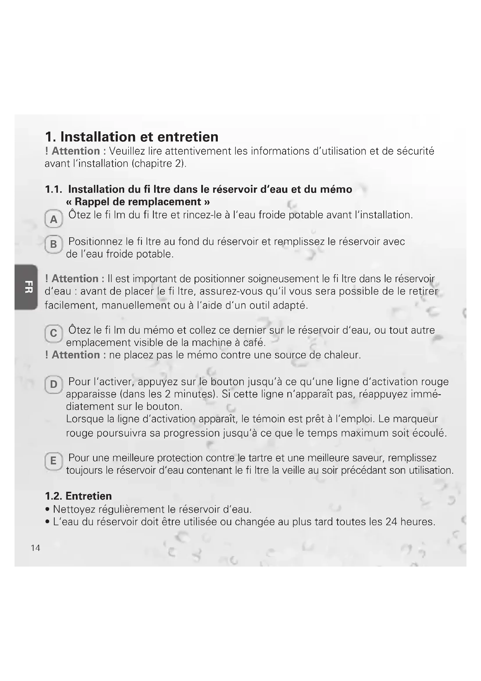 ! Attention : Veuillez lire attentivement les informations d’utilisation et de sécurité avant l‘installation (chapitre 2). 1.1. Installation du fi ltre dans le réservoir d‘eau et du mémo « Rappel de remplacement »