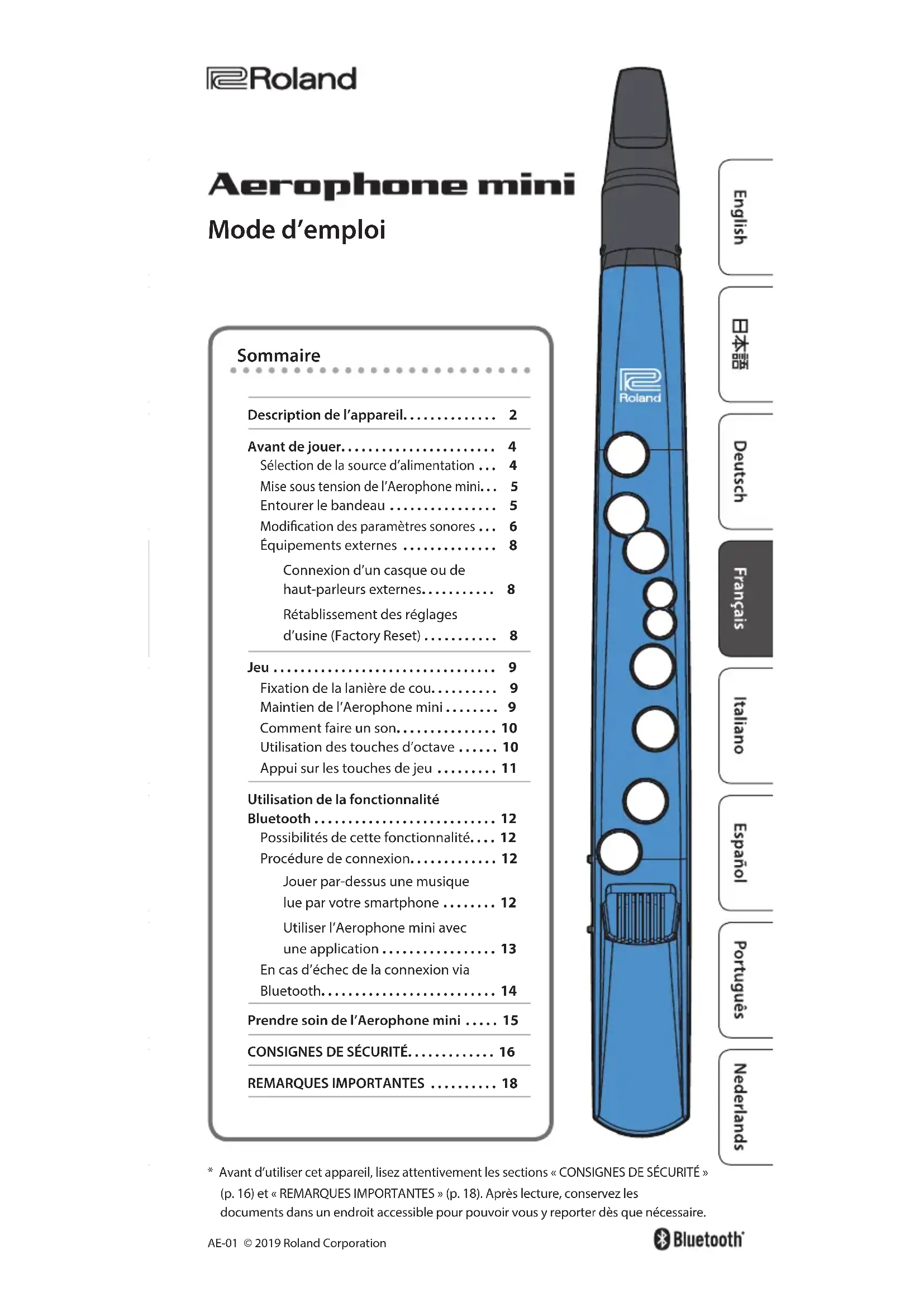 - Avant d’utiliser cet appareil, lisez attentivement les sections «CONSIGNES DE SÉCURITÉ» (p. 16) et «REMARQUES IMPORTANTES» (p. 18). Après lecture, conservez les documents dans un endroit accessible pour pouvoir vous y reporter dès que nécessaire. Sommaire Description de l’appareil.............. 2 Avant de jouer....................... 4 Sélection de la source d’alimentation ... 4 Mise sous tension de l’Aerophone mini... 5 Entourer le bandeau ................ 5 Modication des paramètres sonores ... 6 Équipements externes .............. 8 Connexion d’un casque ou de haut-parleurs externes........... 8 Rétablissement des réglages d’usine (Factory Reset) ........... 8 Jeu ................................. 9 Fixation de la lanière de cou.......... 9 Maintien de l’Aerophone mini . . . . . . . . 9 Comment faire un son............... 10 Utilisation des touches d’octave ...... 10 Appui sur les touches de jeu ......... 11 Utilisation de la fonctionnalité Bluetooth ........................... 12 Possibilités de cette fonctionnalité.... 12 Procédure de connexion............. 12 Jouer par-dessus une musique lue par votre smartphone ........ 12 Utiliser l’Aerophone mini avec une application ................. 13 En cas d’échec de la connexion via Bluetooth.......................... 14 Prendre soin de l’Aerophone mini ..... 15