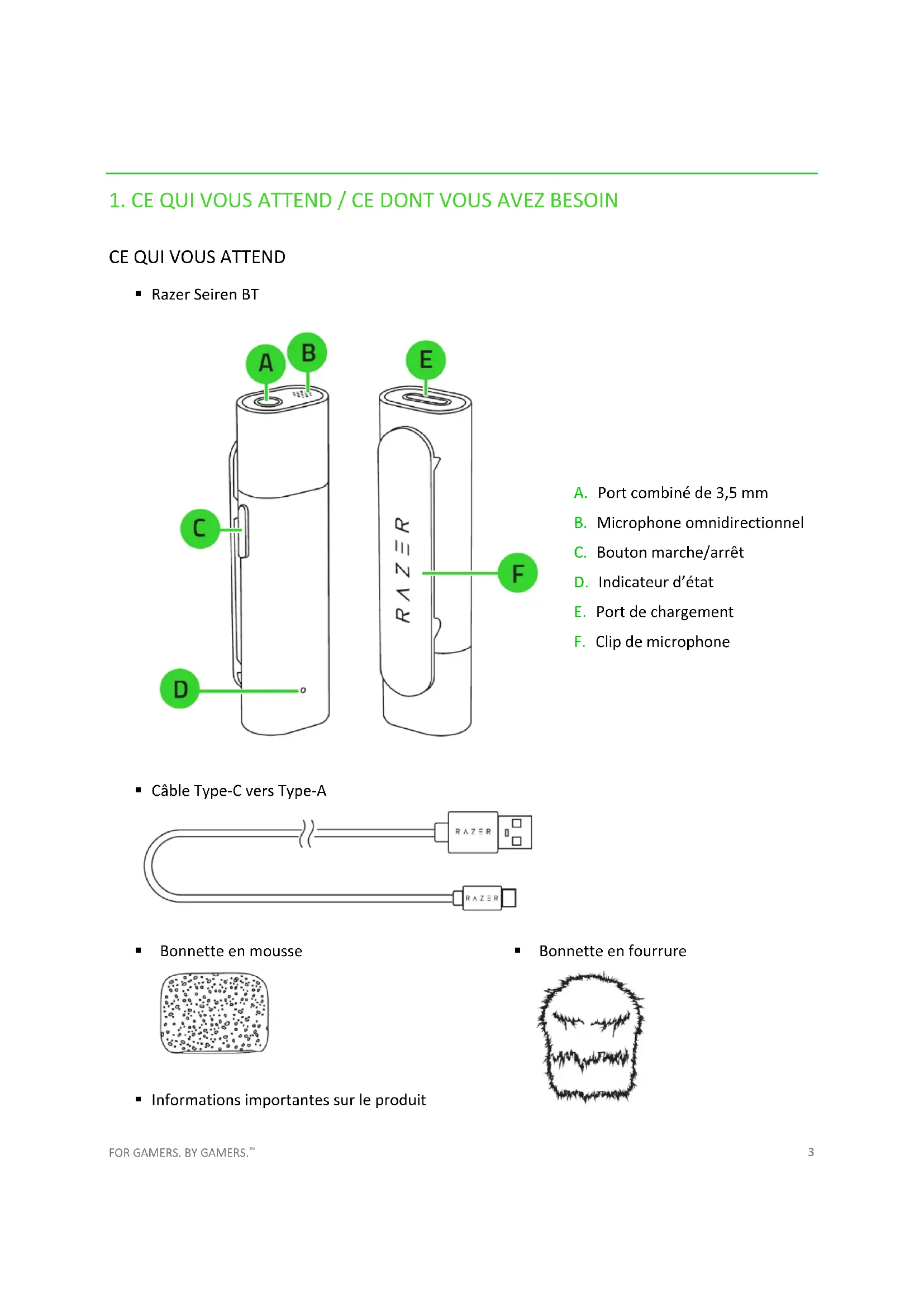 Le Razer Seiren BT nécessite un minimum d'entretien pour le conserver dans un état de fonctionnement optimal. Une fois par mois, nous vous recommandons de le nettoyer avec un chiffon doux ou un coton-tige pour empêcher les dépôts de saleté. N’utilisez pas de savon ou de produits nettoyants agressifs. ALERTE BATTERIE Le Razer Seiren BT contient une batterie rechargeable lithium-ion. En général, l’autonomie de cette batterie dépend de son utilisation. Si vous pensez que la batterie rechargeable lithium-ion du Razer Seiren BT est épuisée (faible charge), essayez de la recharger. Attention : Ne pas ouvrir, endommager ou exposer à des matériaux conducteurs (métal), à l’humidité, à du liquide, du feu ou de la chaleur. De telles pratiques peuvent entraîner l’explosion ou l’écoulement des piles, ce qui peut causer des blessures. L’autonomie des batteries varie avec l’usage que vous en faites.FOR GAMERS. BY GAMERS.