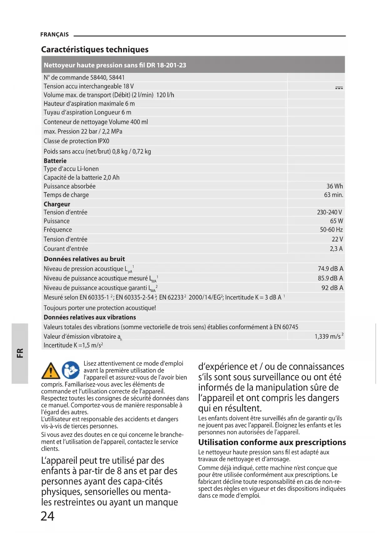 spect des règles en vigueur et des dispositions indiquées dans ce mode d‘emploi. FR25 FRANÇAIS Risques résiduels Malgré l‘utilisation correcte et le respect de toutes les règles de sécurité, des risques résiduels peuvent subsister. Malgré le respect de la notice d‘utilisation, des risques résiduels cachés peuvent exister. Symboles Avertissement / Attention! Lisez le mode d’emploi avant l’utilisation Retirez l‘accu avant d‘eectuer toute intervention de réglage, de nettoyage ou d‘entretien sur la machine. Vapeur, Brume de pulvérisation porter des vêtements de protection Portez des lunettes de protection. Portez des gants de protection. Utilisation d‘une grue. Défense de demeurer dans le liquide transporté Les protéger contre l’humidité. Ne pas exposer la machine à la pluie. Éloignez la machine des enfants. Protéger du froid Classe de protection III Symbole CE Déposez les appareils électriques ou électro- niques défectueux et / ou destinés à liquida- tion au centre de ramassage correspondant. Batterie Lisez le mode d’emploi avant l’utilisation Protégez la batterie des températures supérieures à 40°C. Protégez la batterie de la chaleur et du feu. Protégez la batterie de l‘eau et de l‘hu- midité. Li-Ion Ne jetez pas les batteries avec les déchets domestiques. Déposez les batteries dans un centre de collecte de batteries usagées où elles seront recyclées de façon écologique. Chargeur Avertissement / Attention! Lisez le mode d’emploi avant l’utilisation Fusible de l‘appareil Accu déchargé Batterie chargée Polarité Classe de protection II Symbole CE Déposez les appareils électriques ou électroniques défectueux et / ou destinés à liquidation au centre de ramassage correspondant. Sens de pose Consignes de sécurité pour les nettoyeurs haute pression à batterie Ne pointez pas l‘agrafeuse vers vous ou vers d‘autres personnes à proximité. Portez des lunettes de sécurité et des vêtements de protection appropriés pour vous protéger contre les projections d‘eau et de saleté. Lorsque vous travaillez avec l‘équipement, les personnes à portée de main doivent porter des vêtements de protection. FR26 FRANÇAIS Maintenir les enfants et les personnes présentes à l’écart pendant l’utilisation de l’outil. N‘utilisez pas l‘appareil à proximité des liquides ou gaz inammables. Risque d‘incendie ou d‘explosion en cas de court-circuit. Ne pas pulvériser de liquides inammables, il y a un risque d‘explosion. Ne dirigez pas le jet de l‘appareil vers des appareils comportant des composants électriques, comme l‘intérieur des fours. Il existe un risque de trébuchement lors de l‘utilisation de l‘appareil avec un tuyau d‘aspiration. Le tuyau d‘aspiration ne doit pas être plié, écrasé ou écrasé, car il y a un risque de dommages et de blessures. L‘appareil ne doit pas être utilisé si le tuyau d‘aspiration, les buses ou la lance de pulvérisation sont endomma
