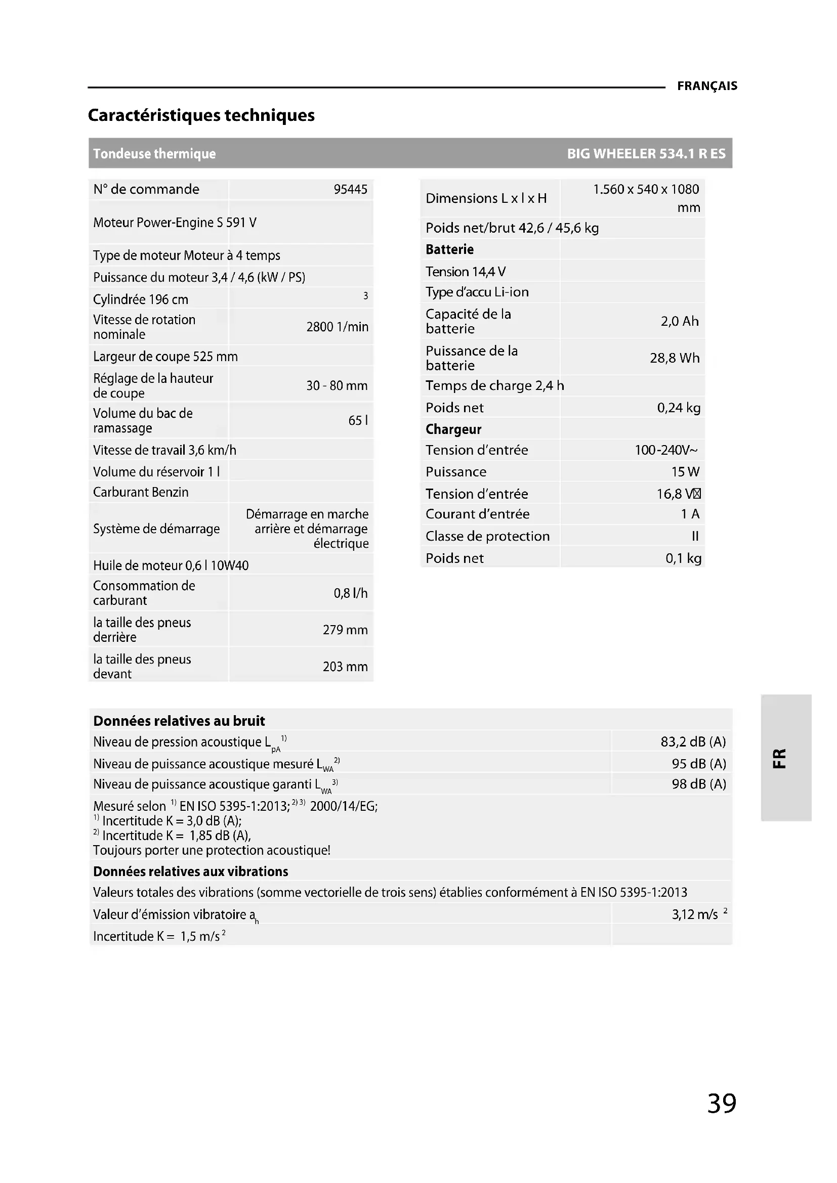 Incertitude K = 1,85 dB (A), Toujours porter une protection acoustique! Données relatives aux vibrations Valeurs totales des vibrations (somme vectorielle de trois sens) établies conformément à EN ISO 5395-1:2013 Valeur d’émission vibratoire a
