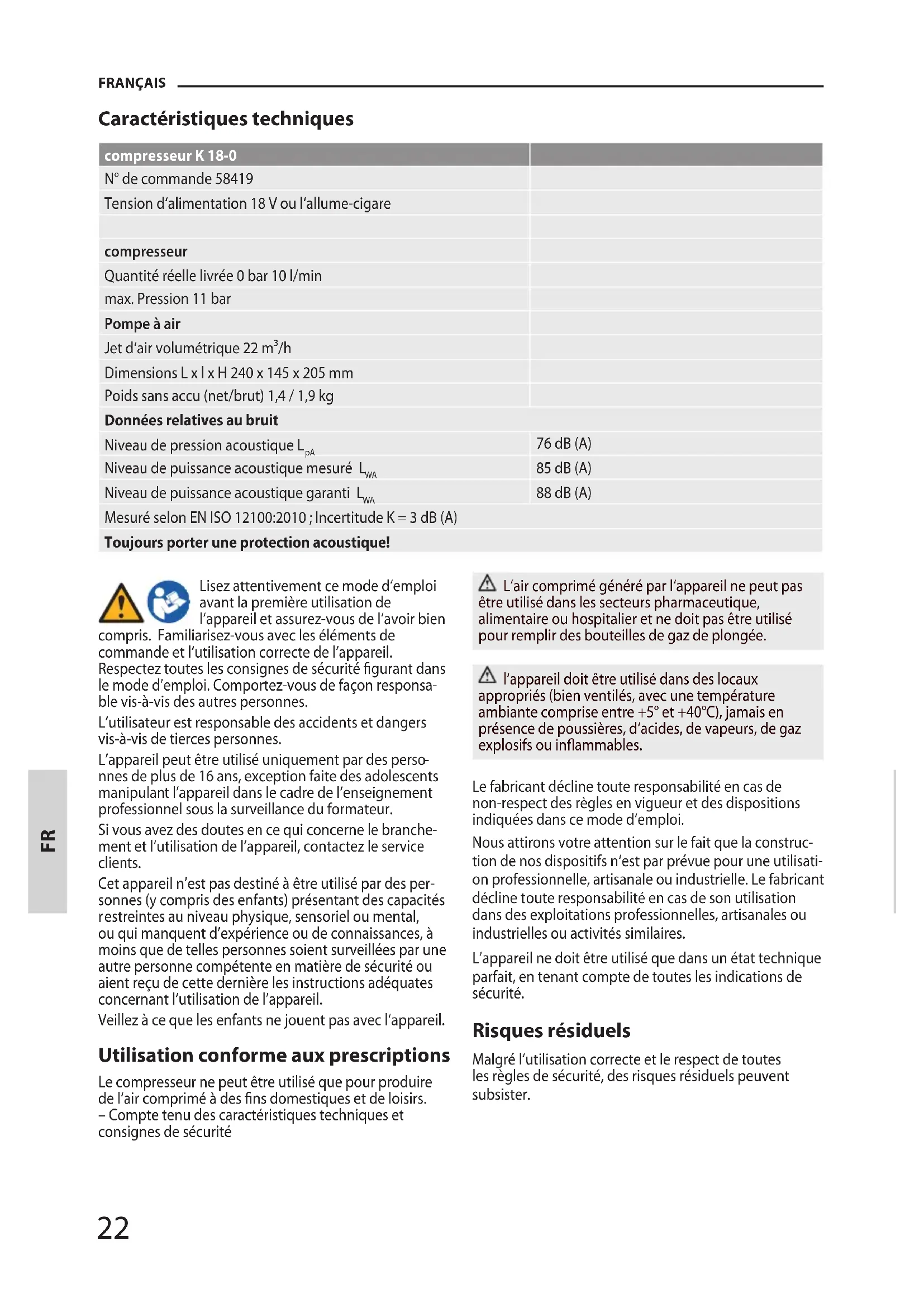 Caractéristiques techniques compresseur K 18-0 N° de commande 58419 Tension d‘alimentation 18 V ou l‘allume-cigare compresseur Quantité réelle livrée 0 bar 10 l/min max. Pression 11 bar Pompe à air Jet d‘air volumétrique 22 m³/h Dimensions L x l x H 240 x 145 x 205 mm Poids sans accu (net/brut) 1,4 / 1,9 kg Données relatives au bruit Niveau de pression acoustique L