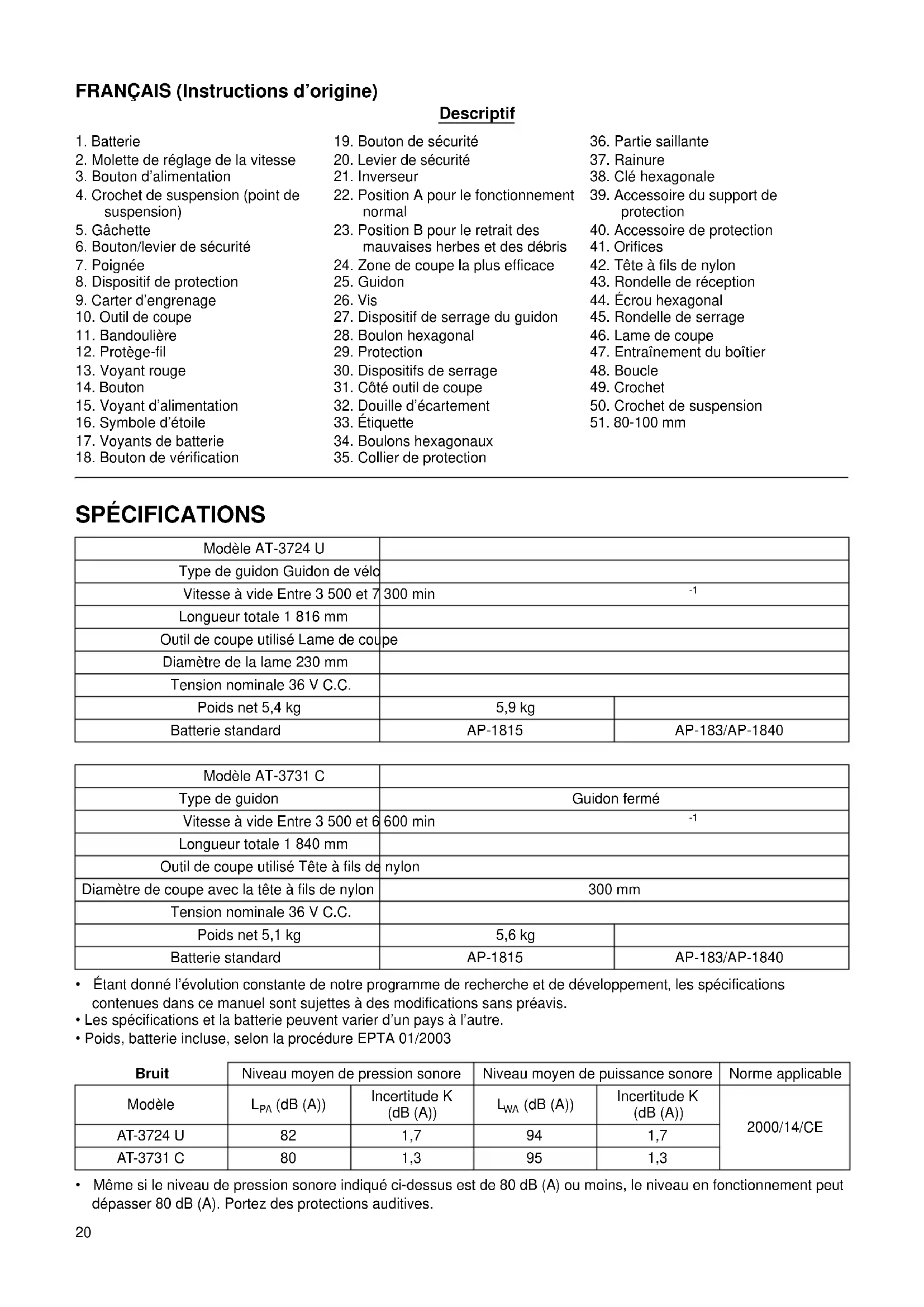 - Certains éléments de la liste peuvent être inclus en tant qu’accessoires standard dans le coffret de l’outil envoyé. Ils peuvent varier suivant les pays. État du dysfonctionnement Cause Mesure Le moteur ne tourne pas. Les batteries ne sont pas installées. Installez les batteries. Problème de batterie (sous tension) Rechargez la batterie. Si cela ne sert à rien, remplacer la batterie. Le système d’entraînement ne fonctionne pas correctement. Faites réparer l’appareil par le centre de service agréé le plus proche. Le moteur s’arrête après une brève utilisation. La rotation est inversée. Changez le sens de rotation avec l’inverseur. Le niveau de chargement de la batterie est faible. Rechargez la batterie. Si cela ne sert à rien, remplacer la batterie. Surchauffe. Cesser d’utiliser l’outil pour le laisser refroidir. Il n’atteint pas le régime maximal. La batterie est mal montée. Montez la batterie comme décrit dans ce manuel. Le niveau de la batterie chute. Rechargez la batterie. Si cela ne sert à rien, remplacer la batterie. Le système d’entraînement ne fonctionne pas correctement. Faites réparer l’appareil par le centre de service agréé le plus proche. L’outil de coupe ne tourne pas : arrêtez immédiatement l’appareil ! Un corps étranger tel qu’une branche est coincé entre le protège-lame et la tête à fil de nylon. Retirez le corps étranger. L’écrou de fixation de la lame de coupe est desserré. Serrez correctement l’écrou selon les consignes de ce guide. La lame de coupe est courbée. Remplacez-la. Le système d’entraînement ne fonctionne pas correctement. Faites réparer l’appareil par le centre de service agréé le plus proche. Vibrations anormales : arrêtez immédiatement l’appareil ! Une extrémité du fil de nylon est cassée. Frappez la tête à fils de nylon sur le sol pendant le fonctionnement de l’outil pour enrouler le fil. La lame de coupe est courbée, fissurée ou usée. Remplacez-la. L’écrou de fixation de la lame de coupe est desserré. Serrez correctement l’écrou selon les consignes de ce guide. La lame de coupe est mal fixée. Le système d’entraînement ne fonctionne pas correctement. Faites réparer l’appareil par le centre de service agréé le plus proche. Impossible d’arrêter l’outil de coupe et le moteur : retirez immédiatement la batterie ! Dysfonctionnement électrique ou électronique. Retirez la batterie et faites réparer l’appareil par votre centre de service agréé le plus proche.32 DEUTSCH (Originalanweisungen) Erklärung der Gesamtdarstellung SPEZIFIKATIONEN