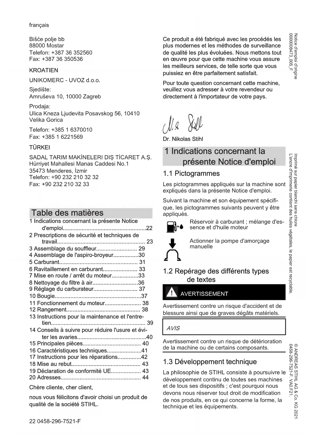 - 20 Adresses Chère cliente, cher client, nous vous félicitons d'avoir choisi un produit de qualité de la société STIHL. Ce produit a été fabriqué avec les procédés les plus modernes et les méthodes de surveillance de qualité les plus évoluées. Nous mettons tout en œuvre pour que cette machine vous assure les meilleurs services, de telle sorte que vous puissiez en être parfaitement satisfait. Pour toute question concernant cette machine, veuillez vous adresser à votre revendeur ou directement à l'importateur de votre pays. Dr. Nikolas Stihl 1 Indications concernant la présente Notice d'emploi p. 44