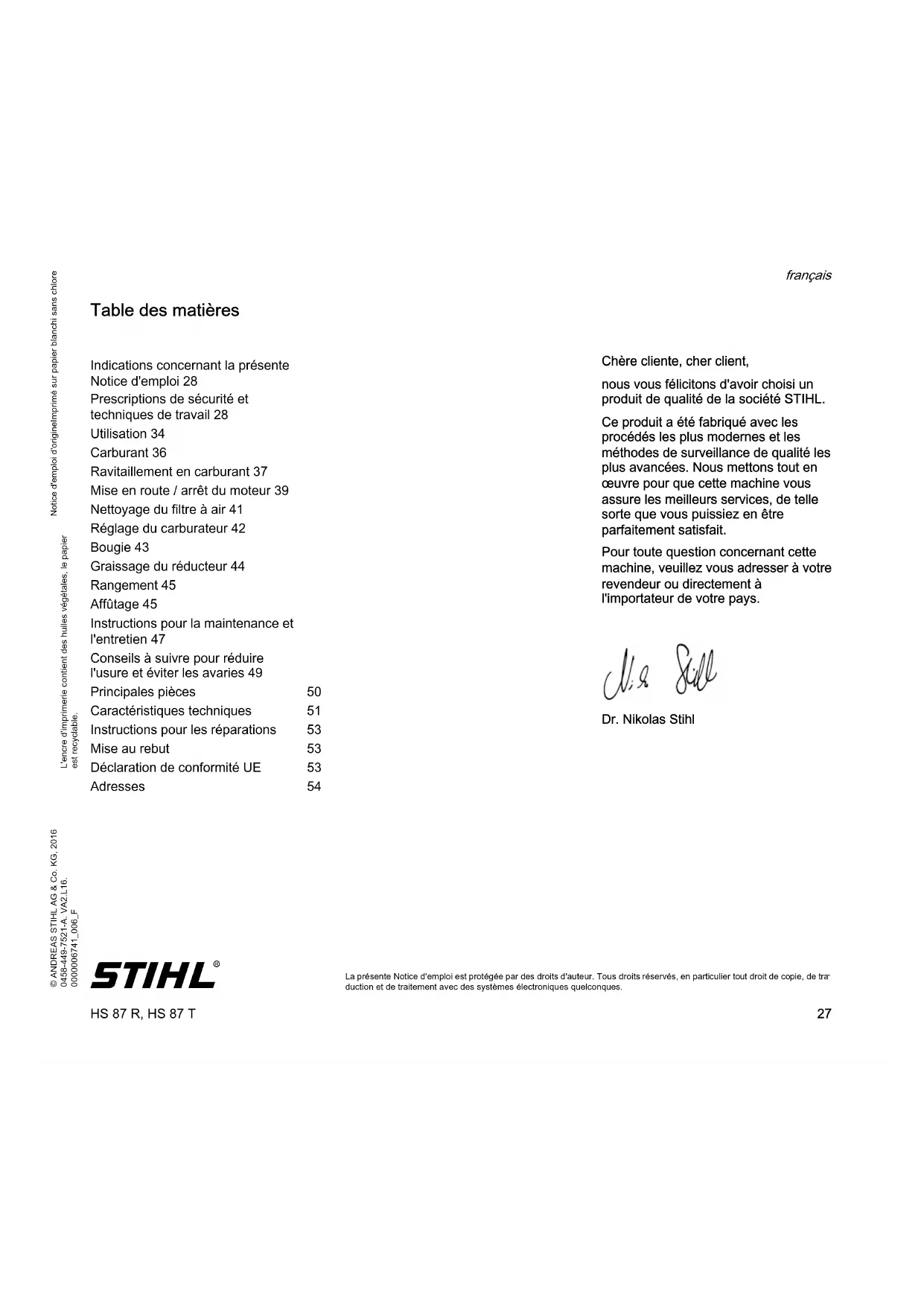 duction et de traitement avec des systèmes électroniques quelconques. Table des matières Chère cliente, cher client, nous vous félicitons d'avoir choisi un produit de qualité de la société STIHL. Ce produit a été fabriqué avec les procédés les plus modernes et les méthodes de surveillance de qualité les plus avancées. Nous mettons tout en œuvre pour que cette machine vous assure les meilleurs services, de telle sorte que vous puissiez en être parfaitement satisfait. Pour toute question concernant cette machine, veuillez vous adresser à votre revendeur ou directement à l'importateur de votre pays. Dr. Nikolas Stihl Indications concernant la présente Notice d'emploi 28 Prescriptions de sécurité et techniques de travail 28 Utilisation 34 Carburant 36 Ravitaillement en carburant 37 Mise en route / arrêt du moteur 39 Nettoyage du filtre à air 41 Réglage du carburateur 42 Bougie 43 Graissage du réducteur 44 Rangement 45 Affûtage 45 Instructions pour la maintenance et l'entretien 47 Conseils à suivre pour réduire l'usure et éviter les avaries 49 Principales pièces 50 Caractéristiques techniques 51 Instructions pour les réparations 53 Mise au rebut 53 Déclaration de conformité UE 53 Adresses 54HS 87 R, HS 87 T français