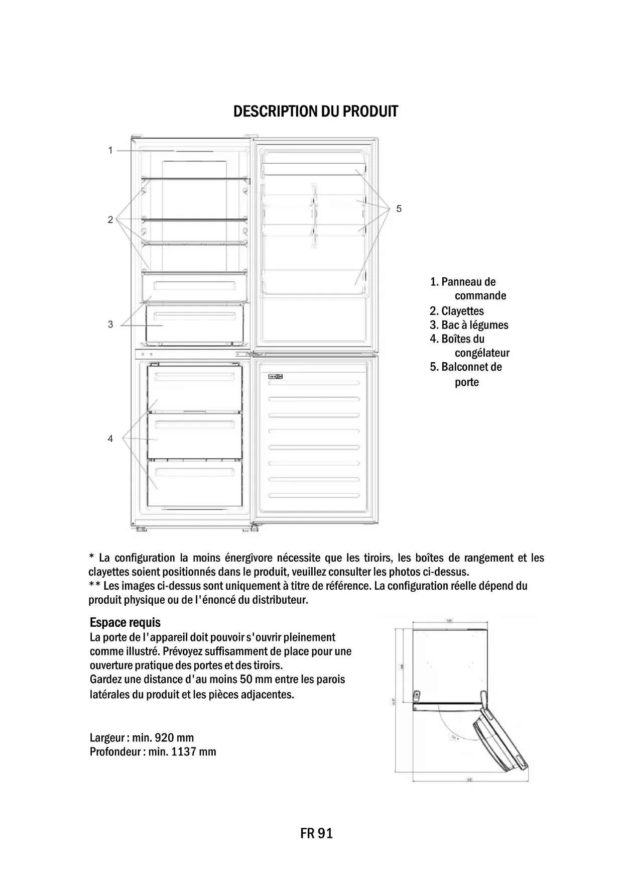 Espace requis La porte de l'appareil doit pouvoir s'ouvrir pleinement comme illustré. Prévoyez suffisamment de place pour une ouverture pratique des portes et des tiroirs. Gardez une distance d'au moins 50 mm entre les parois latérales du produit et les pièces adjacentes. Largeur : min. 920 mm Profondeur : min. 1137 mmFR 92 A. Touche Marche/Arrêt, utilisée pour allumer/éteindre l'appareil B. Touche Wi-Fi, utilisée pour activer/désactiver le Wi-Fi C. Touche Mode, utilisée pour sélectionner la fonction souhaitée D. Touche TEMP, utilisée pour sélectionner la température du réfrigérateur et du congélateur a. L'icône de zone réfrigérateur/congélateur indique quel compartiment de l'appareil est sélectionné b. L'icône Super congélation indique si la fonction Super congélation est activée c. Niveaux de température du congélateur, indiquant quelle est la température sélectionnée dans le congélateur d. L'icône Super refroidissement indique si la fonction est activée e. Niveaux de température du réfrigérateur, indiquant quelle est la température sélectionnée f. Icône de température personnalisée, indiquant si la température a été sélectionnée par l'application g. L'icône du mode Éco indique si le mode Éco est activé h. L'icône de la fonction Vacances indique si la fonction Vacances est activée