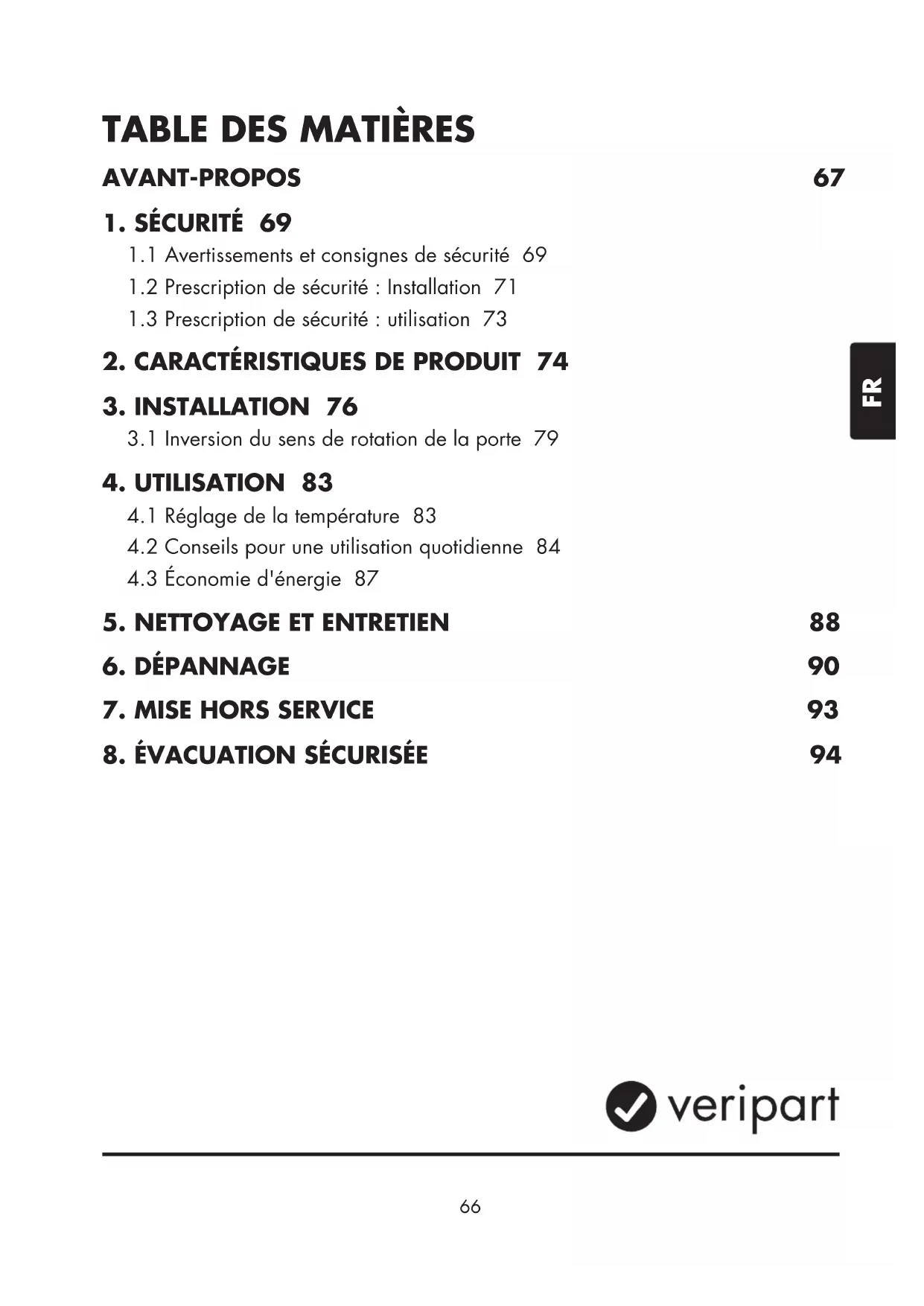 VPTMKV85 - Réfrigérateur Veripart - Notice d'utilisation et mode d'emploi gratuit