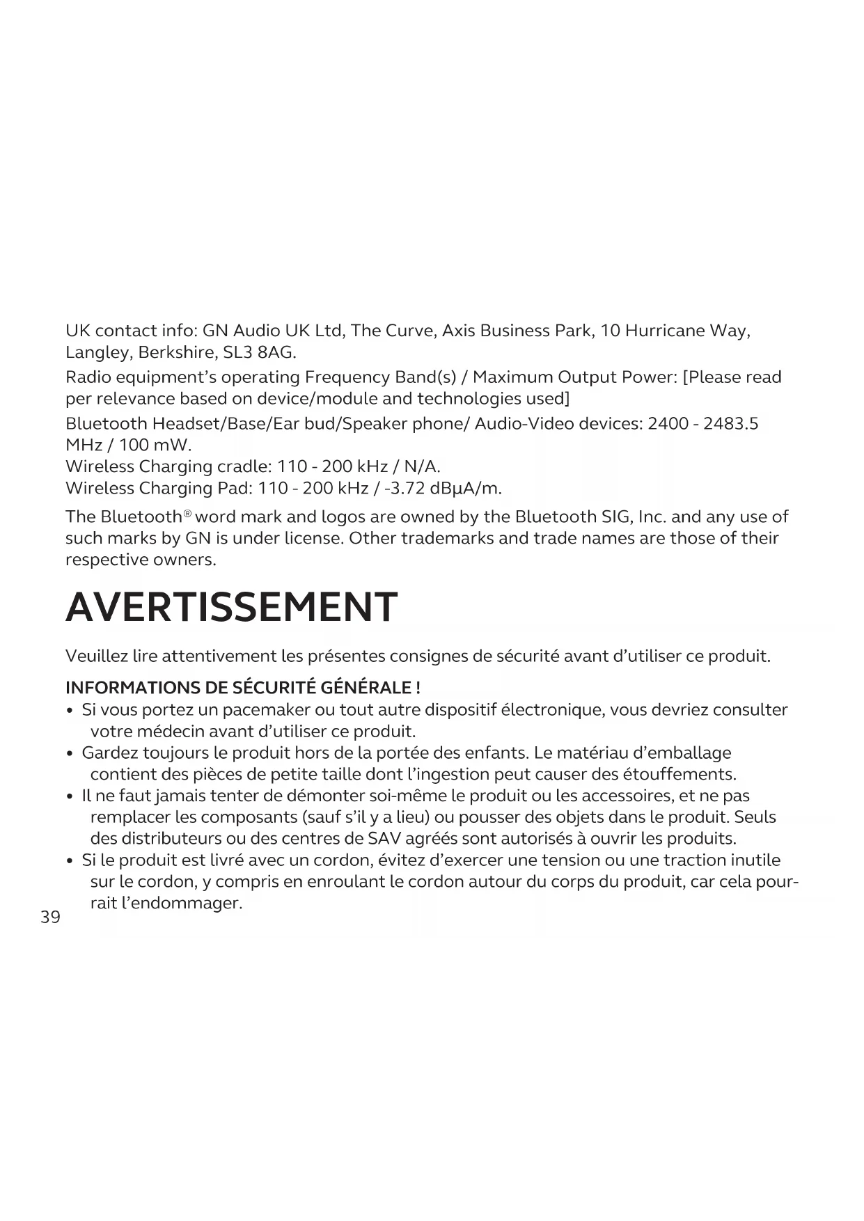 GN déclare par la présente que ce produit satisfait aux exigences essentielles et autres dispositions applicables de la Directive 2014/53/UE (directive relative aux équipements radioélectriques), ainsi qu’aux exigences légales applicables au Royaume-Uni. Pour en savoir plus, veuillez consulter GN Audio A/S ou vous reporter à la section Déclara- tions de conformité sur www.blueparrott.com ou www.jabra.com. Coordonnées pour le Royaume-Uni : GN Audio UK Ltd, The Curve, Axis Business Park, 10 Hurricane Way, Langley, Berkshire, SL3 8AG. Bandes(s) de fréquence de fonctionnement de l’équipement radio / Puissance de sortie maximale : [Veuillez déterminer la pertinence en fonction de l’appareil/du module et des technologies utilisées] Micro-casque Bluetooth/base/écouteur-bouton/poste téléphonique/appareils audio-vidéo : 2400 - 2483,5 MHz / 100 mW. Station de recharge sans fil : 110 - 200 kHz / N.D. AVERTISSEMENTS CONCERNANT LA BATTERIE ! Si le produit contient une pile, veuillez respecter les règles suivantes.