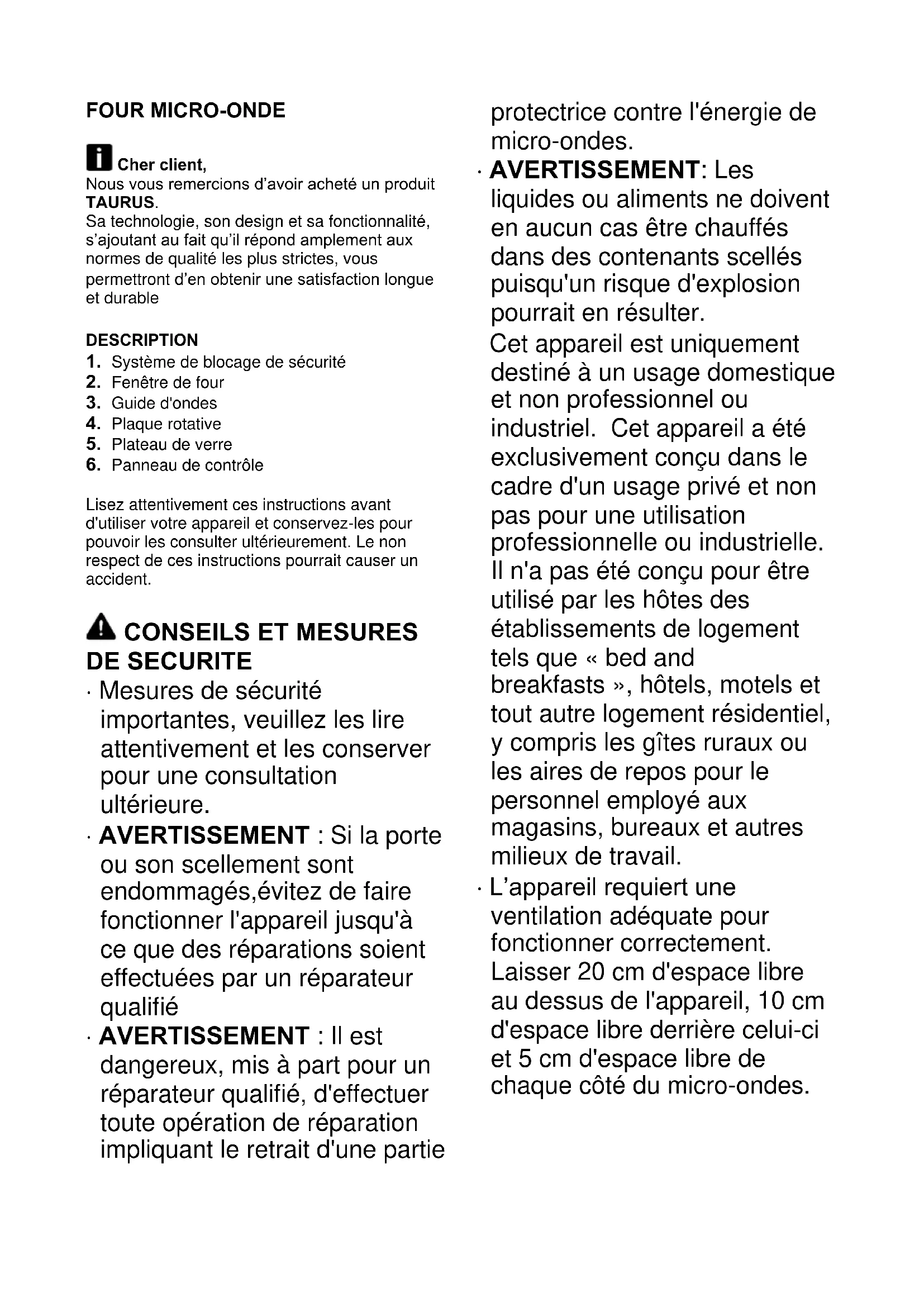 Ready - Four à micro-ondes TAURUS - Notice d'utilisation et mode d'emploi gratuit