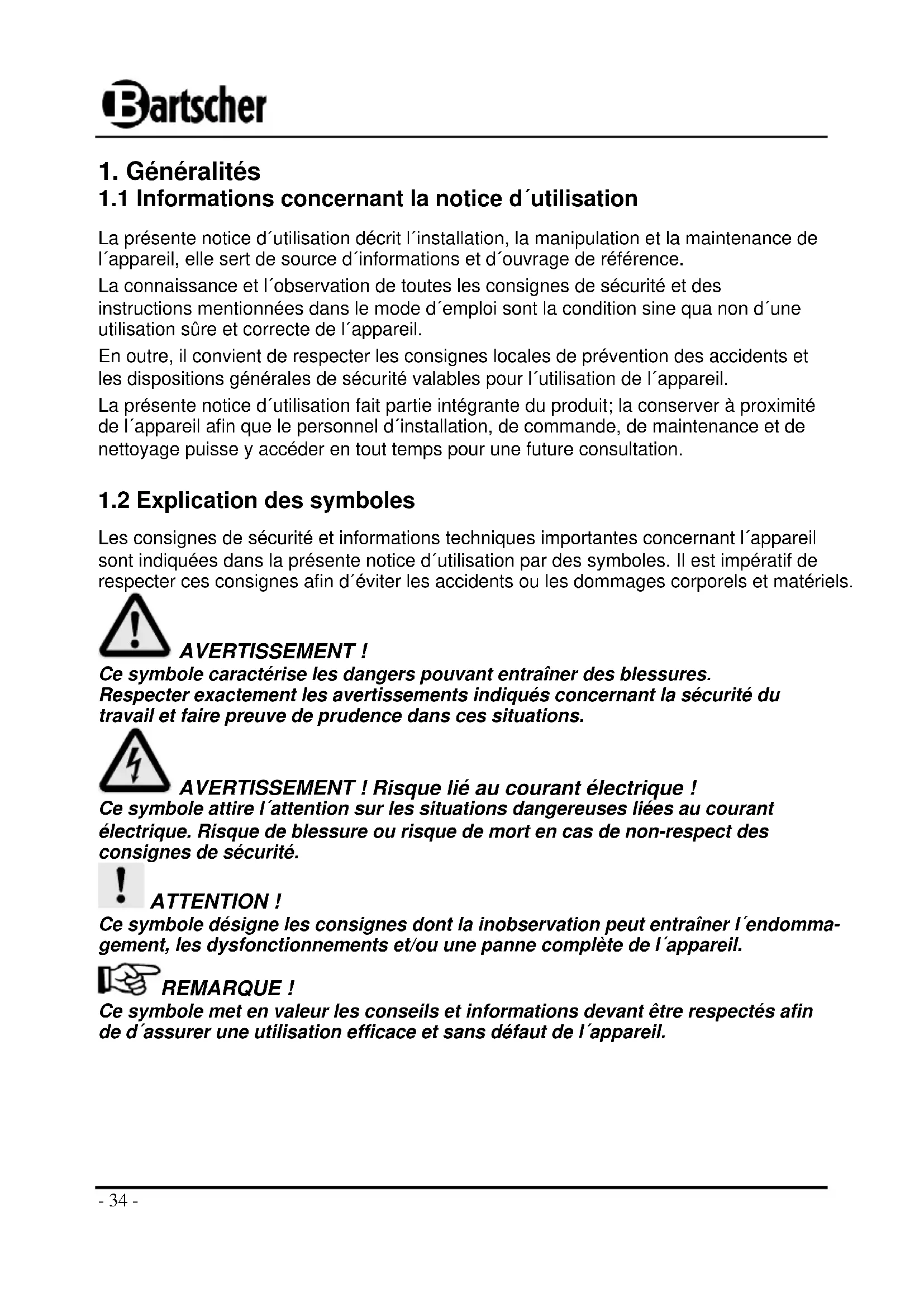 Bartscher GmbH Franz-Kleine-Str. 28 D-33154 Salzkotten Tél.: +49 (0) 5258 971-0 Germany Fax: +49 (0) 5258 971-120 Conservez le mode d’emploi à portée de main du produit ! F/B/CH- 34 -