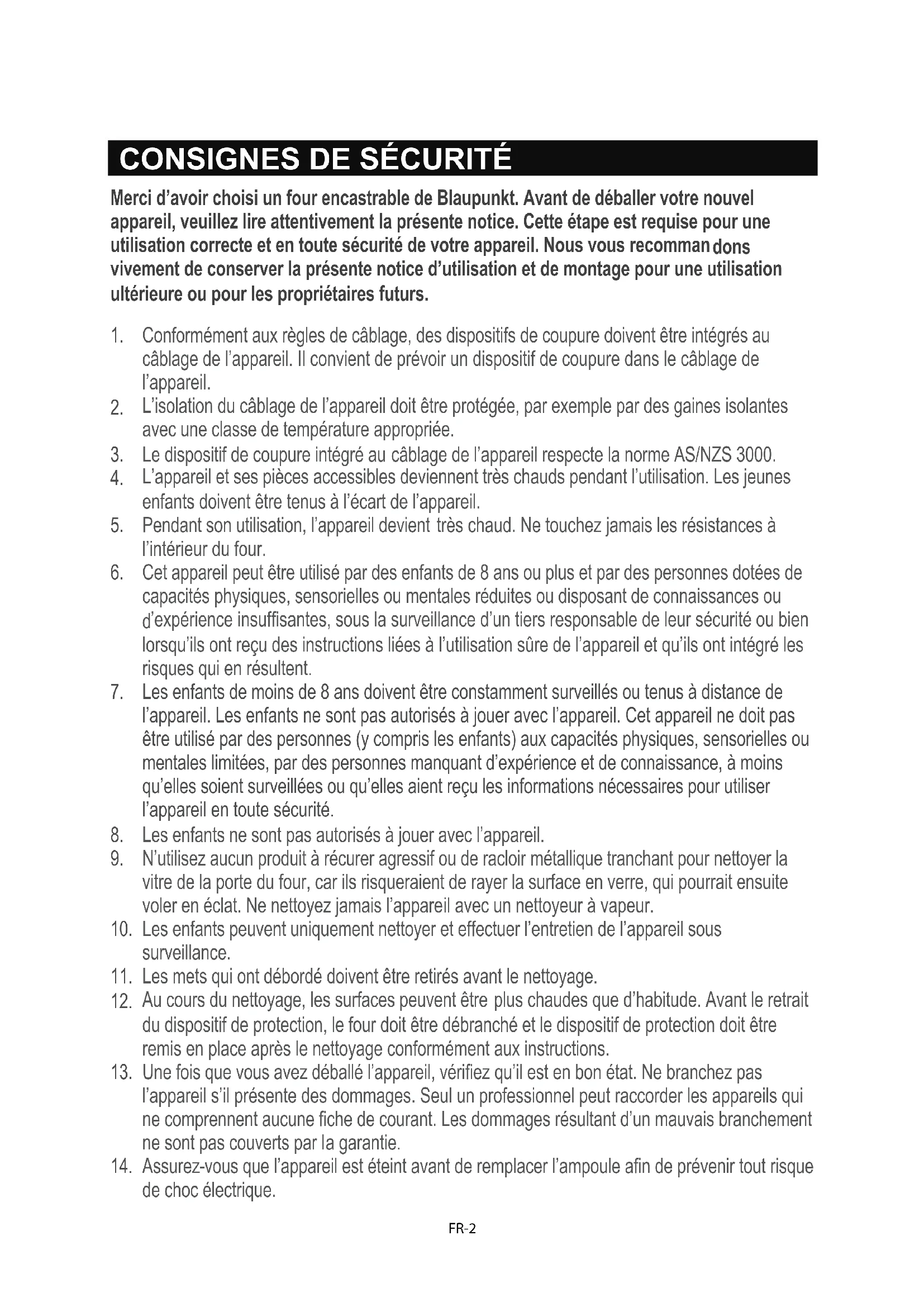 35 FICHE DE DONNÉES (UE 65/2014 et UE 66/2014)CONSIGNES DE SÉCURITÉ Merci d’avoir choisi un four encastrable de Blaupunkt. Avant de déballer votre nouvel appareil, veuillez lire attentivement la présente notice. Cette étape est requise pour une utilisation correcte et en toute sécurité de votre appareil. Nous vous recomman dons vivement de conserver la présente notice d’utilisation et de montage pour une utilisation ultérieure ou pour les propriétaires futurs.