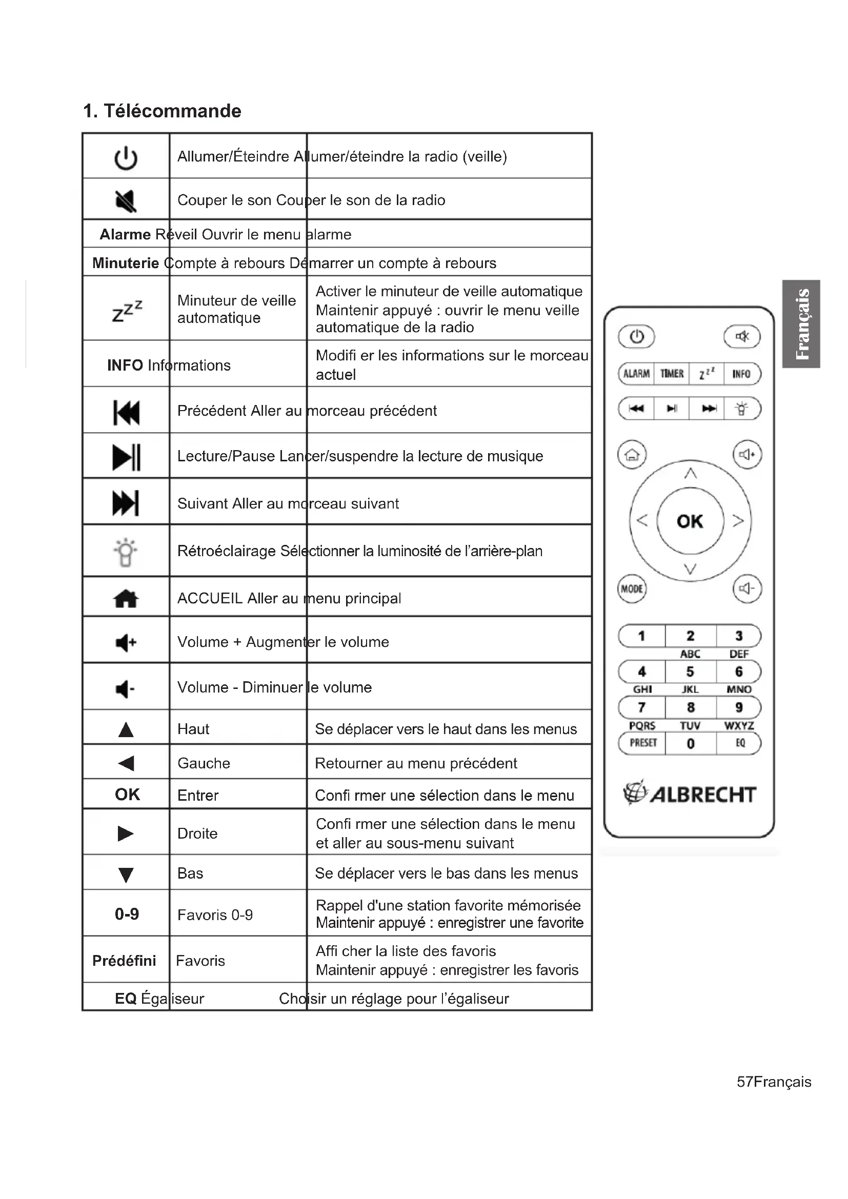 Bas Se déplacer vers le bas dans les menus 0-9 Favoris 0-9 Rappel d'une station favorite mémorisée Maintenir appuyé : enregistrer une favorite Prédéfi ni Favoris Af cher la liste des favoris Maintenir appuyé : enregistrer les favoris EQ Égaliseur Choisir un réglage pour l’égaliseur58 Français Français