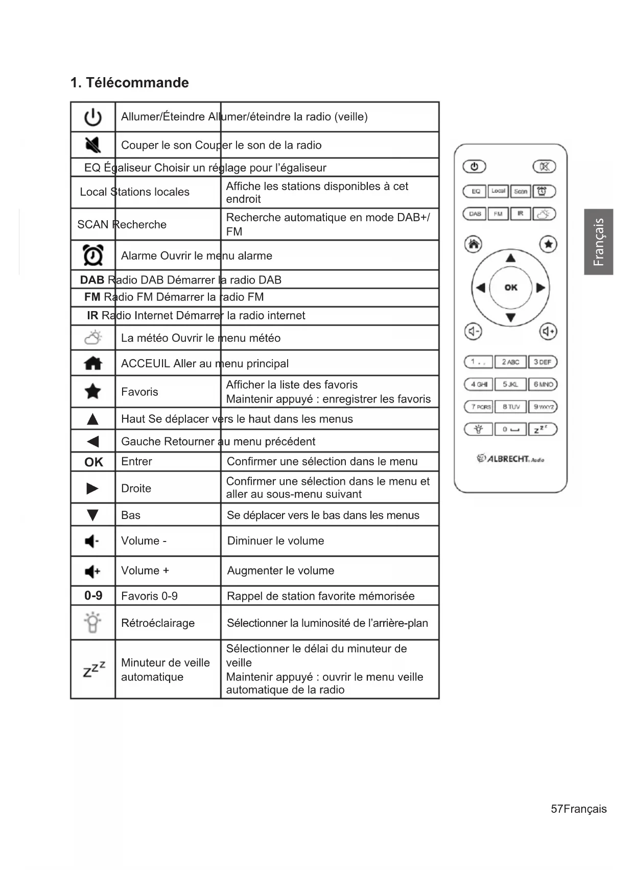 Bas Se déplacer vers le bas dans les menus Volume - Diminuer le volume Volume + Augmenter le volume 0-9 Favoris 0-9 Rappel de station favorite mémorisée Rétroéclairage Sélectionner la luminosité de l’arrière-plan Minuteur de veille automatique Sélectionner le délai du minuteur de veille Maintenir appuyé : ouvrir le menu veille automatique de la radio58 Français Français