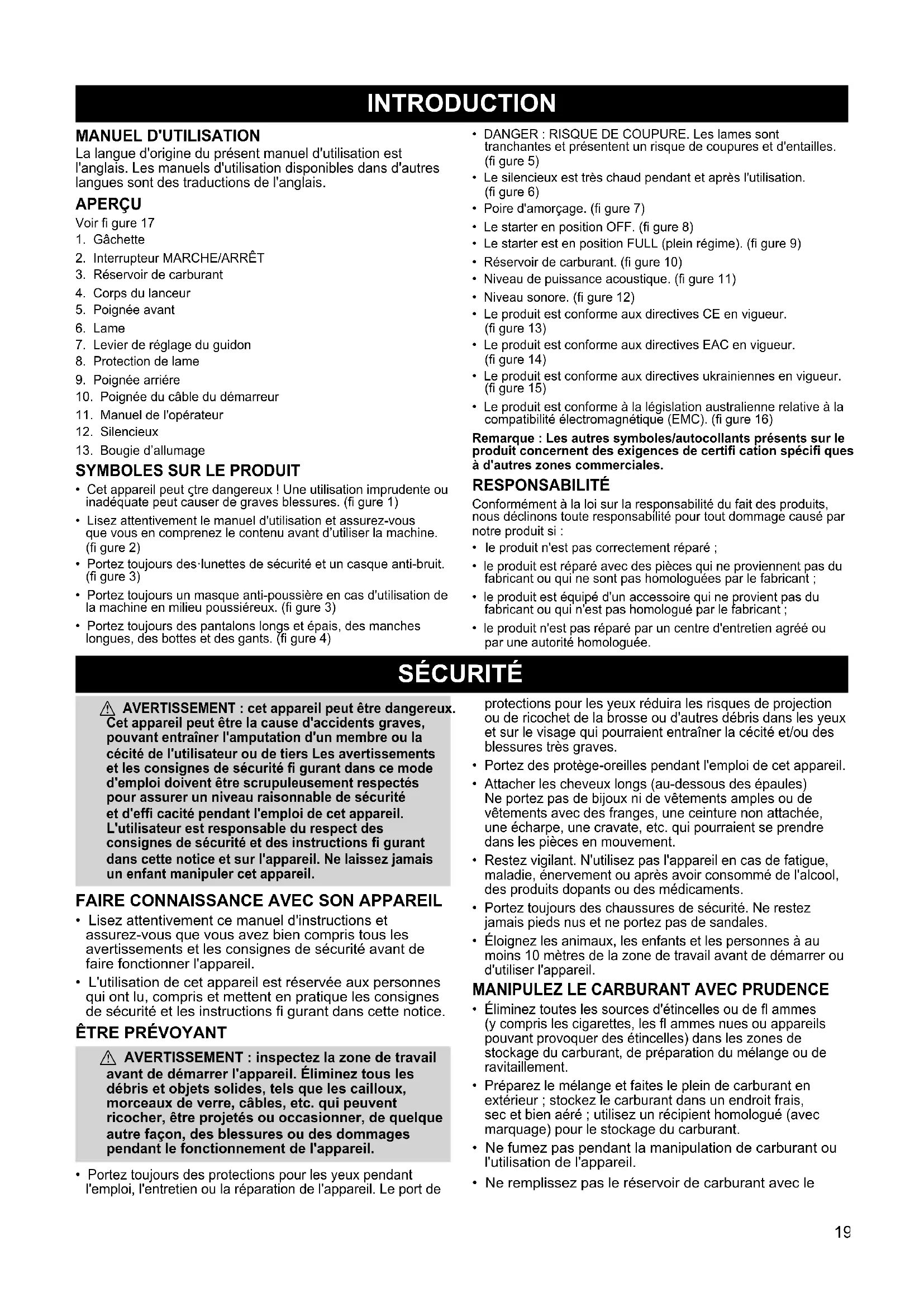 - Stockez-la dans un endroit sec, hors de la portée des enfants. AVIS DE SÉCURITÉ : l’exposition prolongée à des vibrations pendant l'utilisation d'outils manuels équipés d'un moteur à essence peut être responsable de troubles vasculaires ou neurologiques au niveau des doigts, des mains et/ou des articulations chez les personnes sujettes à des troubles circulatoires ou des gonfl ements anormaux. Des lésions vasculaires chez les personnes saines ont été associées à une utilisation prolongée de ce type d'outils par temps froid. À l'apparition de symptômes, tels qu'un engourdissement, une douleur, un manque de force, un changement de couleur ou de texture de la peau ou une perte de sensibilité dans les doigts, les mains ou les articulations, arrêtez immédiatement d'utiliser cet outil et consultez un médecin. Un système anti-vibration ne garantit pas l'élimination de ces problèmes. Les personnes qui utilisent régulièrement des outils motorisés doivent surveiller attentivement leur condition physique et l'état de cet appareil. MONTAGE a AVERTISSEMENT : si la machine est livrée assemblée, répétez toutes les opérations pour vous assurer qu'elle est correctement montée et que tous les éléments de fi xation sont parfaitement bloqués. Suivez toutes les informations de sécurité présentes dans le manuel et sur l'appareil.