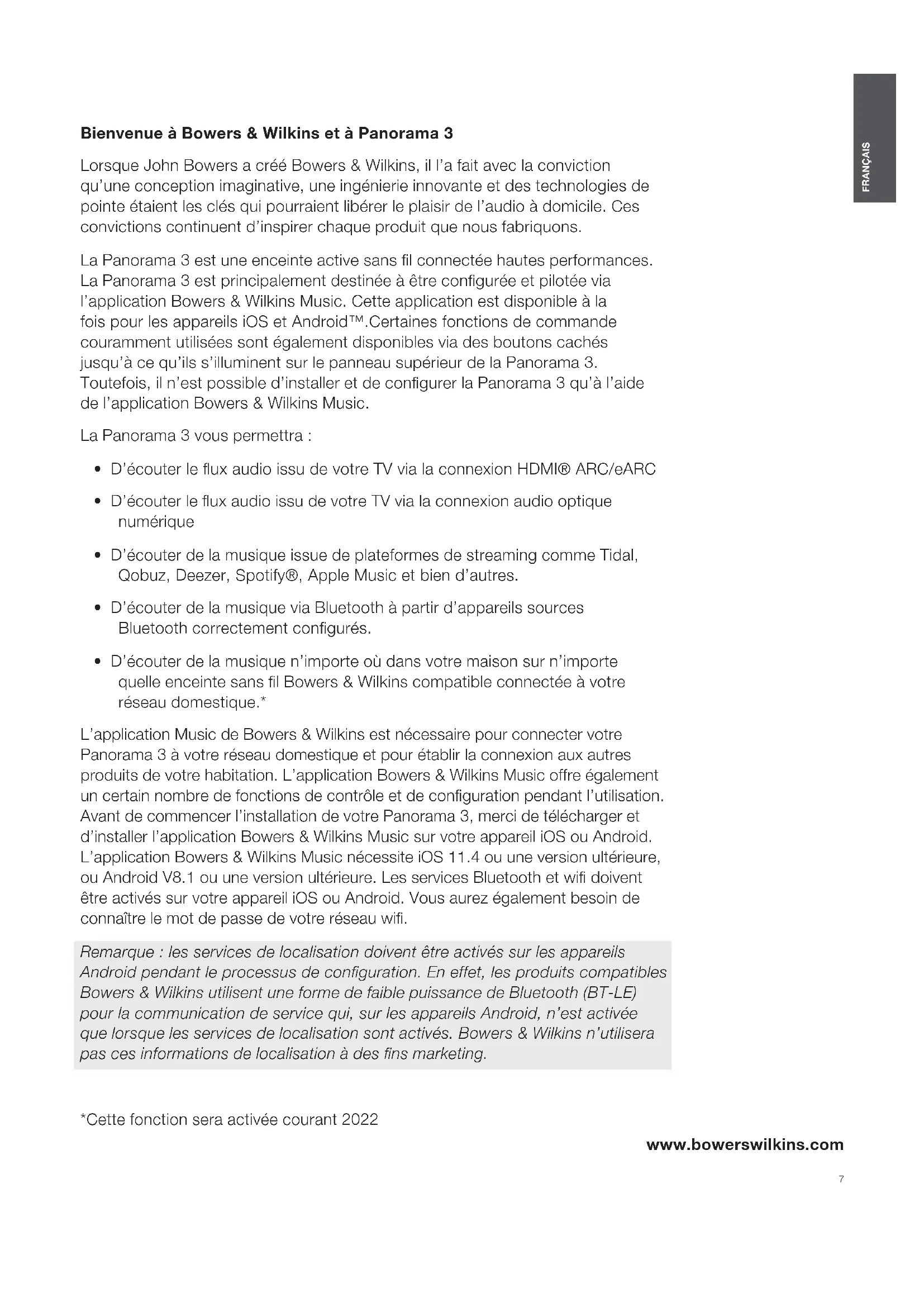 - D’écouter de la musique n’importe où dans votre maison sur n’importe quelle enceinte sans l Bowers&Wilkins compatible connectée à votre réseau domestique.* L’application Music de Bowers&Wilkins est nécessaire pour connecter votre Panorama3 à votre réseau domestique et pour établir la connexion aux autres produits de votre habitation. L’application Bowers&Wilkins Music offre également un certain nombre de fonctions de contrôle et de conguration pendant l’utilisation. Avant de commencer l’installation de votre Panorama3, merci de télécharger et d’installer l’application Bowers&Wilkins Music sur votre appareil iOS ou Android. L’application Bowers&Wilkins Music nécessite iOS11.4 ou une version ultérieure, ou Android V8.1 ou une version ultérieure. Les services Bluetooth et wi doivent être activés sur votre appareil iOS ou Android. Vous aurez également besoin de connaître le mot de passe de votre réseau wi. Remarque : les services de localisation doivent être activés sur les appareils Android pendant le processus de conguration. En effet, les produits compatibles Bowers&Wilkins utilisent une forme de faible puissance de Bluetooth (BT-LE) pour la communication de service qui, sur les appareils Android, n’est activée que lorsque les services de localisation sont activés. Bowers&Wilkins n’utilisera pas ces informations de localisation à des ns marketing. *Cette fonction sera activée courant 2022 FRANÇAIS Table of Contents FRANÇAIS 7