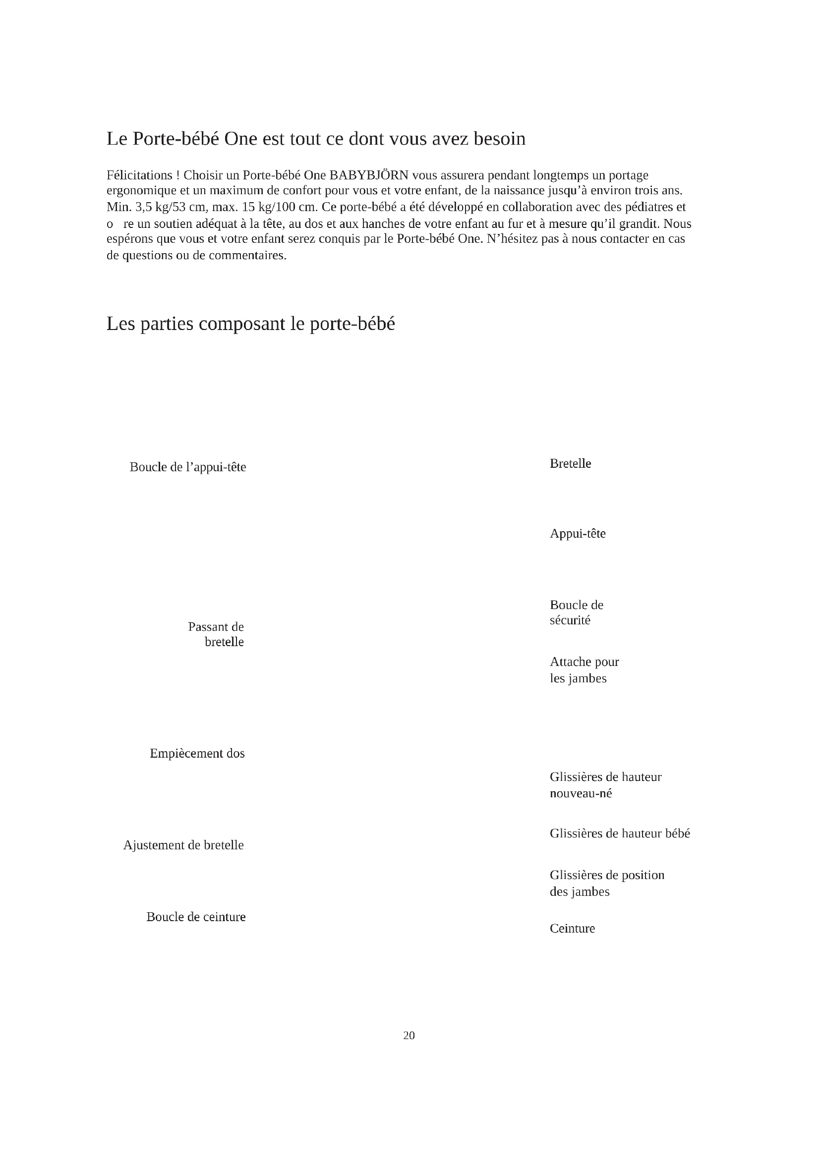 Les parties composant le porte-bébé Boucle de l’appui-tête Passant de bretelle Empiècement dos Boucle de ceinture Ajustement de bretelle Bretelle Appui-tête Boucle de sécurité Attache pour les jambes Glissières de position des jambes Ceinture Glissières de hauteur nouveau-né Glissières de hauteur bébé Le Porte-bébé One est tout ce dont vous avez besoin Félicitations ! Choisir un Porte-bébé One BABYBJÖRN vous assurera pendant longtemps un portage ergonomique et un maximum de confort pour vous et votre enfant, de la naissance jusqu’à environ trois ans. Min. 3,5 kg/53 cm, max. 15 kg/100 cm. Ce porte-bébé a été développé en collaboration avec des pédiatres et ore un soutien adéquat à la tête, au dos et aux hanches de votre enfant au fur et à mesure qu’il grandit. Nous espérons que vous et votre enfant serez conquis par le Porte-bébé One. N’hésitez pas à nous contacter en cas de questions ou de commentaires.Ny bild nr 2