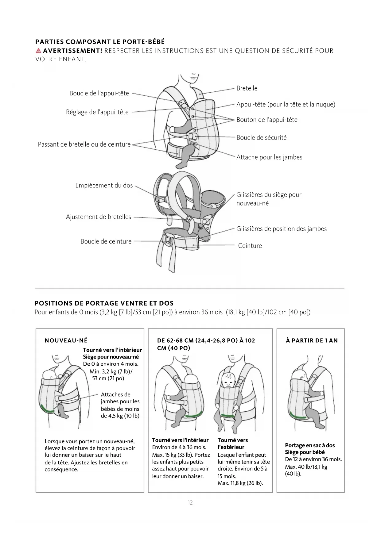 Portage en sac à dos Siège pour bébé De 12 à environ 36mois. Max. 40 lb/18,1 kg (40 lb). Boucle de l’appui-tête Passant de bretelle ou de ceinture Bretelle Appui-tête (pour la tête et la nuque) Bouton de l'appui-tête Boucle de sécurité Attache pour les jambes Empiècement du dos Boucle de ceinture Ajustement de bretelles Glissières de position des jambes Ceinture Glissières du siège pour nouveau-né Réglage de l’appui-tête NOUVEAUNÉ Lorsque vous portez un nouveau-né, élevez la ceinture de façon à pouvoir lui donner un baiser sur le haut de la tête. Ajustez les bretelles en conséquence. Tourné vers l’intérieur Siège pour nouveau-né De 0 à environ 4 mois. Min. 3,2 kg (7 lb)/ 53 cm (21 po) Attaches de jambes pour les bébés de moins de 4,5 kg (10 lb)