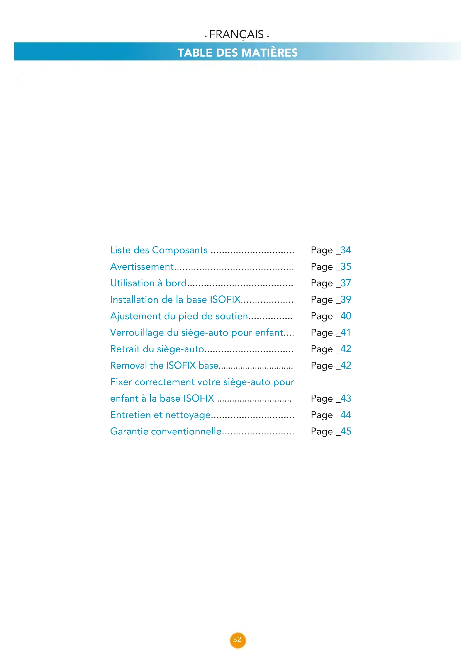 Liste des Composants .............................. Avertissement........................................... Utilisation à bord...................................... Installation de la base ISOFIX................... Ajustement du pied de soutien................ Verrouillage du siège-auto pour enfant.... Retrait du siège-auto................................ Removal the ISOFIX base............................... Fixer correctement votre siège-auto pour enfant à la base ISOFIX .............................. Entretien et nettoyage.............................. Garantie conventionnelle.......................... Page _34 Page _35 Page _37 Page _39 Page _40 Page _41 Page _42 Page _42 Page _43 Page _44 Page _45• FRANÇAIS •