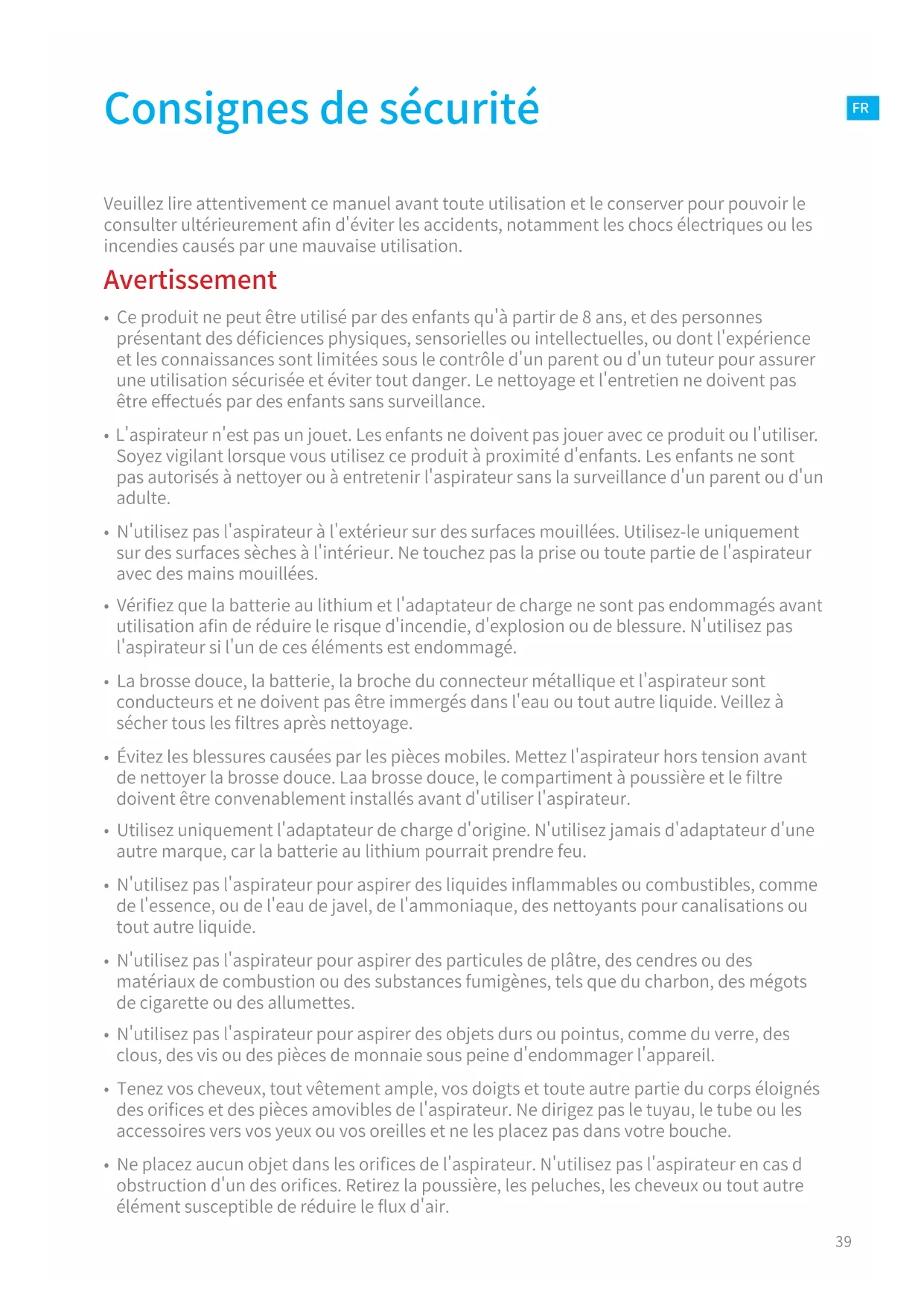- Ne placez aucun objet dans les orices de l'aspirateur. N'utilisez pas l'aspirateur en cas d obstruction d'un des orices. Retirez la poussière, les peluches, les cheveux ou tout autre élément susceptible de réduire le ux d'air. Consignes de sécurité Avertissement FR40