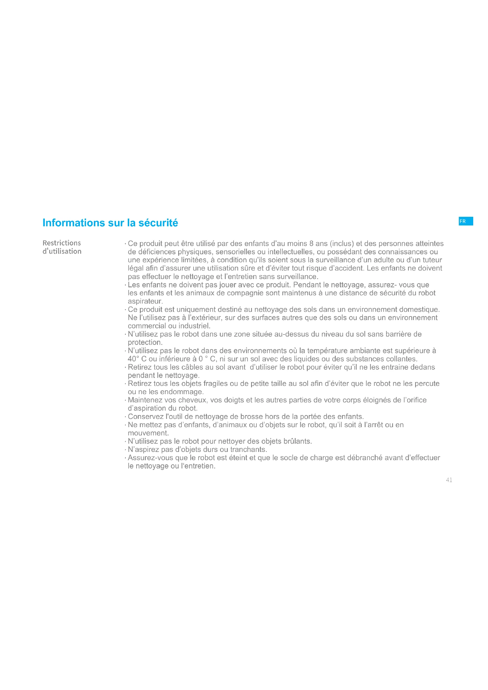 Les enfants ne doivent pas jouer avec ce produit. Pendant le nettoyage, assurez- vous que les enfants et les animaux de compagnie sont maintenus à une distance de sécurité du robot aspirateur.
