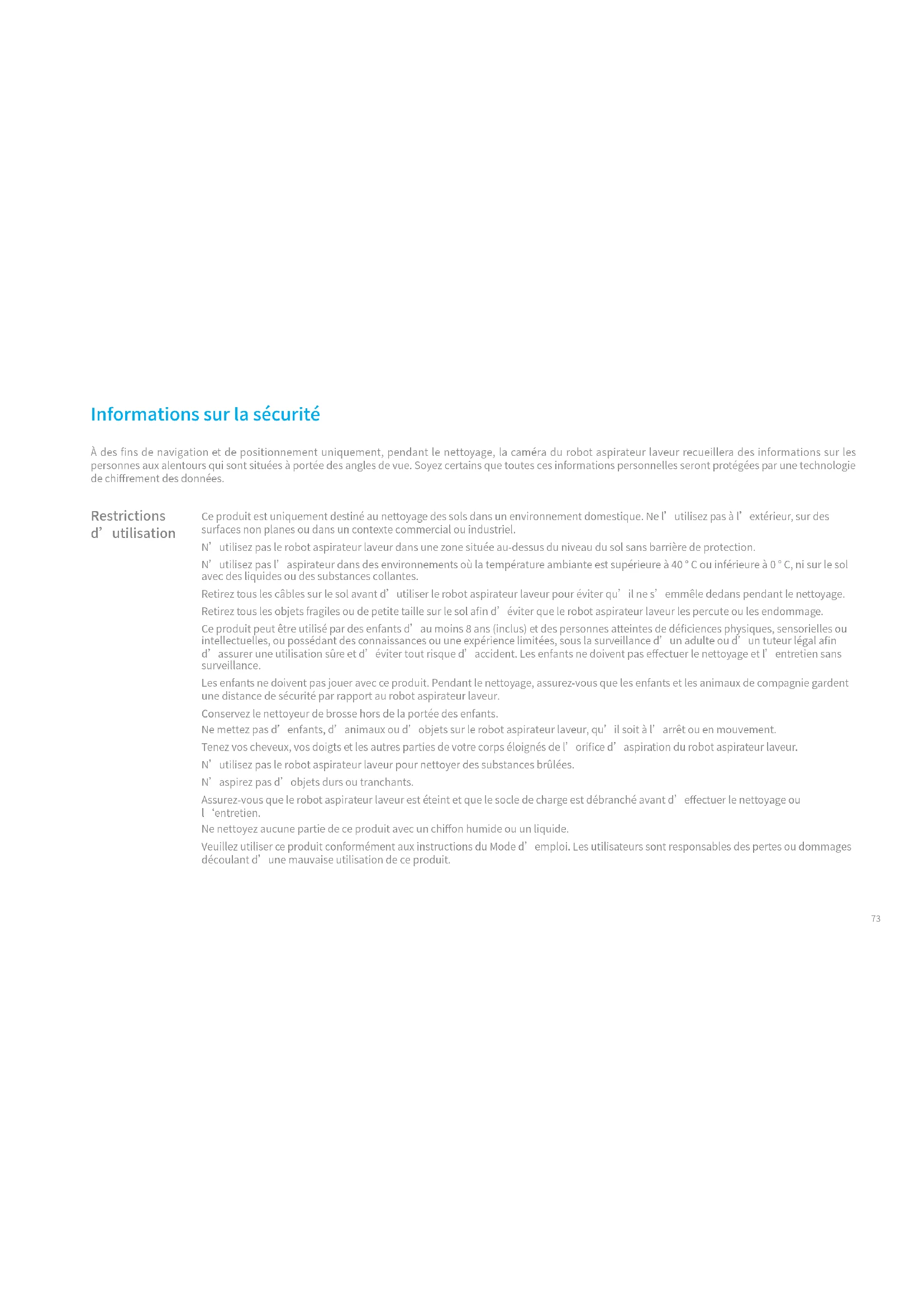 Maintenez le bouton enfoncé pour allumer le robot aspirateur laveur. Lorsque le voyant d’alimentation devient blanc, le robot aspirateur laveur est en mode veille. Pour éteindre le robot aspirateur laveur, maintenez le bouton enfoncé pendant qu’il est à l’arrêt. La mise hors tension du robot aspirateur laveur mettra n au nettoyage en cours.82 Mode d’utilisation