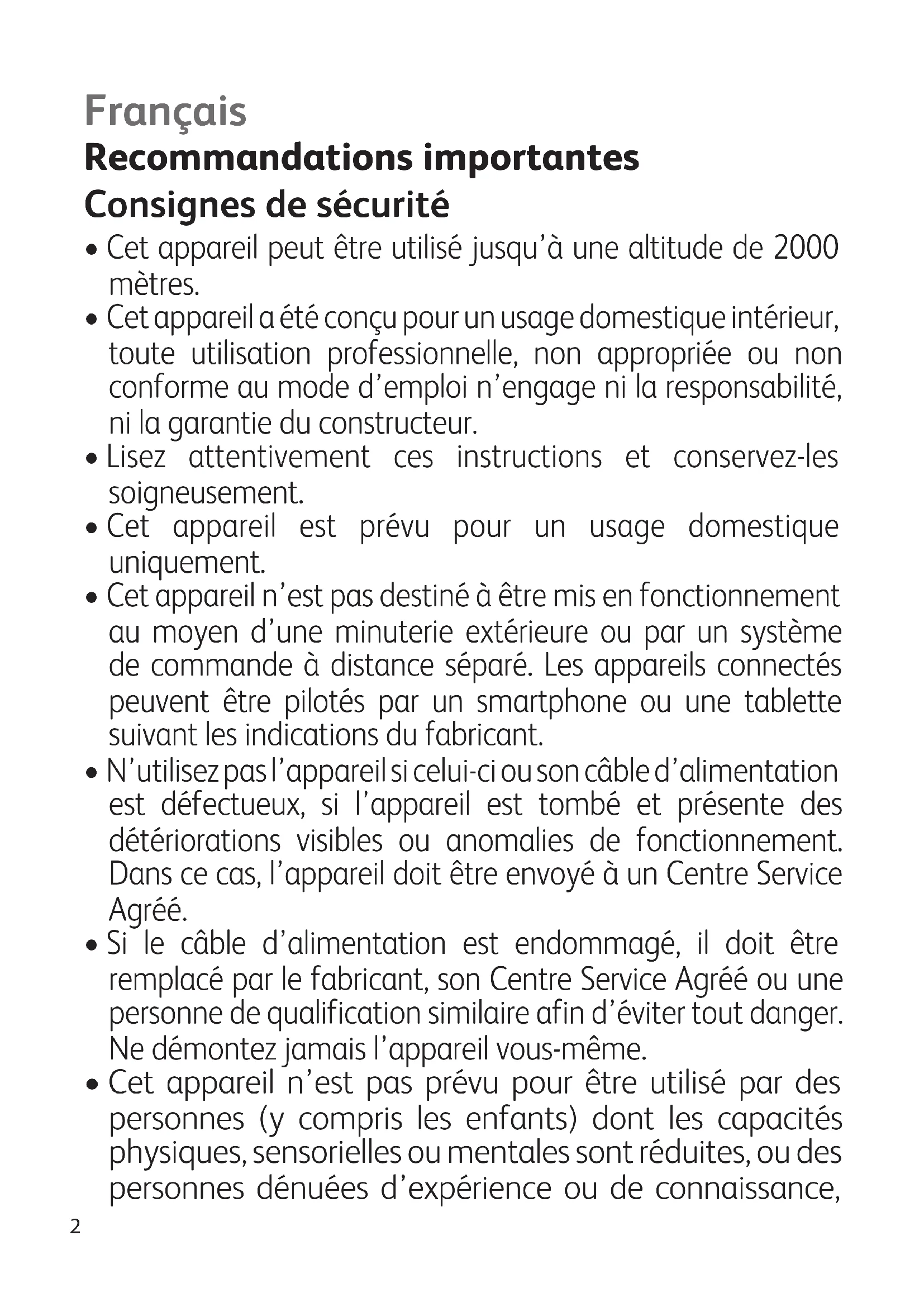 - Cet appareil peut être utilisé par des enfants de 8 ans et plus et les personnes manquant d’expérience et de connaissances ou dont les capacités physiques, sensorielles ou mentales sont réduites, si elles ont été formées et encadrées quant à l’utilisation de l’appareil d’une manière sûre et connaissent les risques encourus. Les enfants ne doivent pas jouer avec l’appareil. Le nettoyage et l’entretien par l’utilisateur ne doit pas être fait par des enfants à moins qu’ils soient âgés de 8 ans et plus et supervisés. Tenir l’appareil et son cordon hors de la portée des enfants de moins 8 ans.