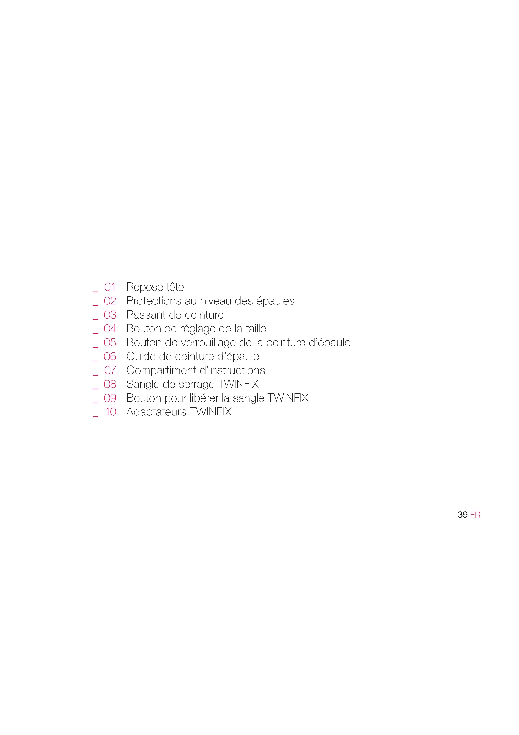 Repose tête Protections au niveau des épaules Passant de ceinture Bouton de réglage de la taille Bouton de verrouillage de la ceinture d’épaule Guide de ceinture d’épaule Compartiment d’instructions Sangle de serrage TWINFIX Bouton pour libérer la sangle TWINFIX Adaptateurs TWINFIX _ 01 _ 02 _ 03 _ 04 _ 05 _ 06 _ 07 _ 08 _ 09 _ 10 IM 2230.01 TRANSFORMER_iTECH int.indd 39 18/6/21 15:3440