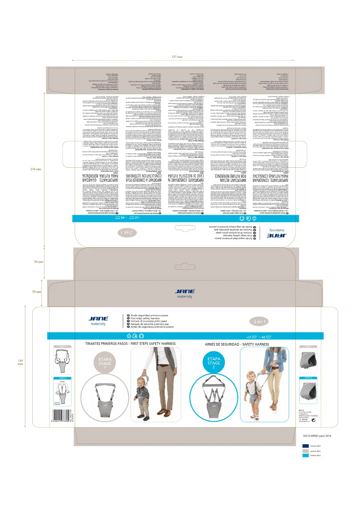 ÉTAPES ÉTAPE I : Bretelles premiers pas: Ce produit doit être utilisé lorsque votre enfant commence à marcher. Confortable et pratique à transporter. L'adulte tient la barre d'apprentissage au lieu de donner la main à l'enfant : il s'utilise avec une seule main. Il favorise une position confortable pour l'adulte, grâce à ses sangles ajustables qui s'adaptent à la bonne hauteur du bébé. Elles permettent à l'enfant d'acquérir une bonne posture, tout en lui évitant de mauvaises chutes durant son apprentissage de la mobilité. Les sangles confèrent un meilleur niveau de sécurité au bébé lors de ses premiers pas. Montage : Étape 1 (+12 mois) -Régler l'entre-jambes à l'aide de la fermeture éclair. Connecter les sangles de la barre d'apprentissage au harnais. -Écouter le clic de sécurité des quatre boucles et régler les sangles à la hauteur qui leur correspond. ÉTAPE II : Harnais de Sécurité + Barre d'apprentissage : Pour cette étape il faut que l'enfant sache déjà marcher. Il permet de renforcer la puissance de contrôle sur les mouvements de l'enfant, ce dernier ne pourra pas échapper à votre attention. Il facilite une promenade de l'enfant confortable et sûre, tout en permettant à l'accompagnant de garder toujours l'enfant dans son champ de vision. Montage : Étape 2 (+18 mois) Connectez la barre d'apprentissage en suivant les pas antérieurs sans connecter les boucles de l'avant, uniquement celles de l'arrière. Prenez les bretelles qui portent la pièce métallique ou le mousqueton. Connectez le mousqueton avec la partie arrière centrale du corps du harnais et connectez les boucles des bretelles au harnais avant. N'oubliez pas d'ajuster les sangles à la hauteur nécessaire au confort de l'adulte et à la sécurité de l'enfant. Ajustez aussi avec la fermeture éclair de la zone de l'entre-jambes si nécessaire. Avis important: Gardez cette information pour consultations ultérieures. -Pour la sécurité de votre enfant: -Le harnais doit rester ajusté pour limiter le mouvement du bébé. -Ne pas utiliser le harnais sur des lits ou des berceaux. -Vérifiez que le harnais est correctement fixé en appuyant sur les attaches, on entendra un « click ». -Pour des motifs de sécurité le harnais ne doit être ni réparé, ni rallongé avec d'autres types d'ancrages ou de sangles. -Souvenez-vous que même lorsque le harnais est convenablement installé, il ne remplace pas votre vigilance à l'égard de votre bébé. -Ne pas utiliser le harnais si vous détectez un signe quelconque de détérioration ou de dommage sur les sangles ou les systèmes de fermeture. -AVERTISSEMENT! Ne laissez jamais l'enfant sans surveillance. -AVERTISSEMENT! Soyez conscient du danger lorsque vous utilisez des sangles près de portes automatiques, d'escaliers mécaniques...etc. -AVERTISSEMENT! Gardez hors de portée de l'enfant lorsque vous ne l'utilisez pas. -AVERTISSEMENT! N'utilisez pas ce harnais avec des véhicules motorisés ou électriques. -Recommandé jusqu'à 48 mois. -Le produit peut être légèrement différent de celui présenté sur la photo. Conçu en Espagne - Fabriqué en Chine. Harnais de sécurité premiers pas
