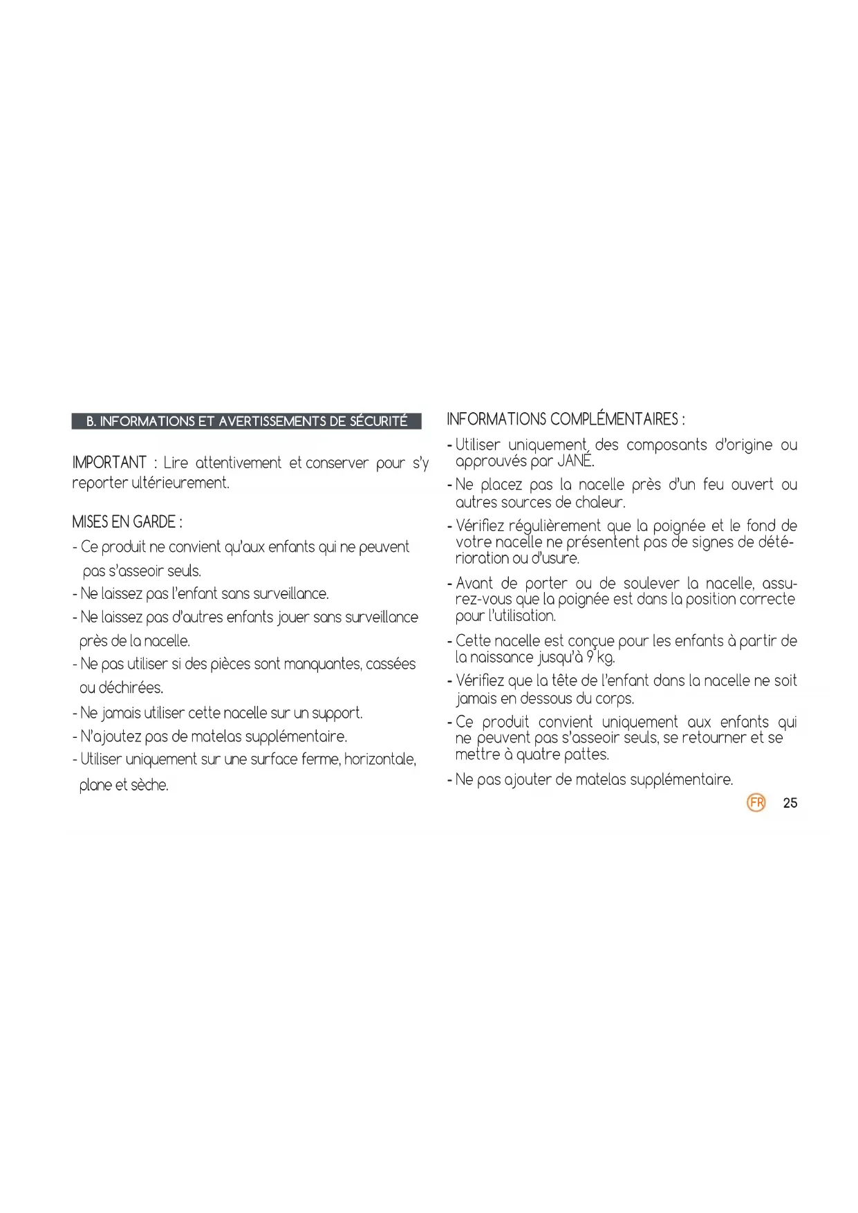 B. INFORMATIONS ET AVERTISSEMENTS DE SÉCURITÉ IMPORTANT : Lire attentivement et conserver pour s’y reporter ultérieurement. MISES EN GARDE : - Ce produit ne convient qu’aux enfants qui ne peuvent pas s’asseoir seuls. - Ne laissez pas l’enfant sans surveillance. - Ne laissez pas d’autres enfants jouer sans surveillance près de la nacelle. - Ne pas utiliser si des pièces sont manquantes, cassées ou déchirées. - Ne jamais utiliser cette nacelle sur un support. - N’ajoutez pas de matelas supplémentaire. - Utiliser uniquement sur une surface ferme, horizontale, plane et sèche. INFORMATIONS COMPLÉMENTAIRES : - Utiliser uniquement des composants d’origine ou approuvés par JANÉ. - Ne placez pas la nacelle près d’un feu ouvert ou autres sources de chaleur. - Vériez régulièrement que la poignée et le fond de votre nacelle ne présentent pas de signes de dété- rioration ou d’usure. - Avant de porter ou de soulever la nacelle, assu- rez-vous que la poignée est dans la position correcte pour l’utilisation. - Cette nacelle est conçue pour les enfants à partir de la naissance jusqu’à 9 kg. - Vériez que la tête de l’enfant dans la nacelle ne soit jamais en dessous du corps. - Ce produit convient uniquement aux enfants qui