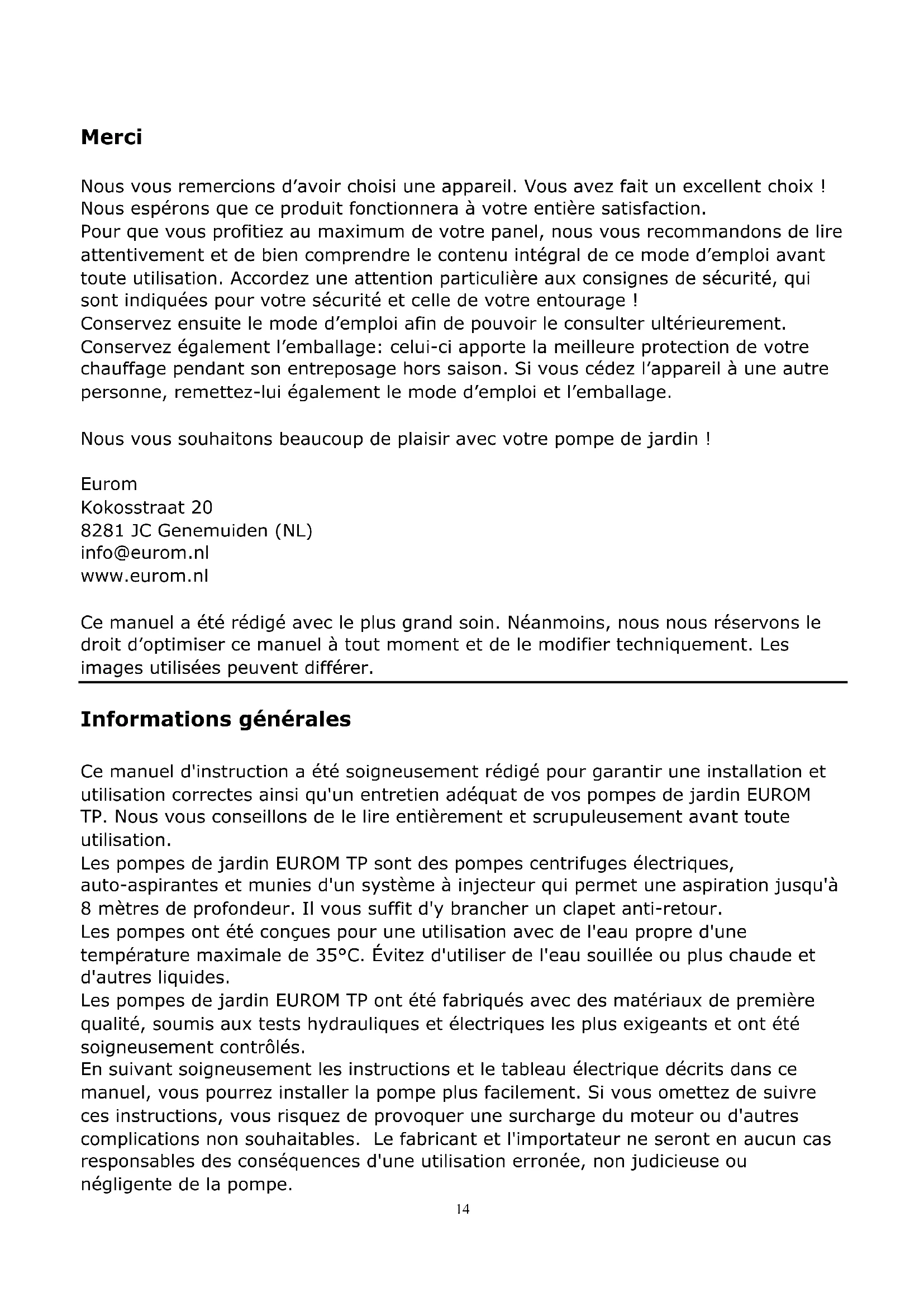 Entsorgung Innerhalb der EU weist dieses Symbol darauf hin, dass dieses Pro- dukt nicht mit dem gewöhnlichen Hausmüll entsorgt werden darf. Altgeräte enthalten wertvolle Stoffe, die verwertet werden können und müssen, um die Umwelt und die Gesundheit der Menschen nicht durch eine unkontrollierte Müllsammlung zu schädigen. Bringen Sie Altgeräte daher zu einer dafür vorgesehenen Deponie oder wenden Sie sich an das Geschäft, wo Sie das Gerät gekauft haben. Diese können dafür sorgen, dass möglichst viele Teile des Geräts wieder- verwendet werden. CE-Deklaration Sehe Seite 34.14 Merci Nous vous remercions d’avoir choisi une appareil. Vous avez fait un excellent choix ! Nous espérons que ce produit fonctionnera à votre entière satisfaction. Pour que vous profitiez au maximum de votre panel, nous vous recommandons de lire attentivement et de bien comprendre le contenu intégral de ce mode d’emploi avant toute utilisation. Accordez une attention particulière aux consignes de sécurité, qui sont indiquées pour votre sécurité et celle de votre entourage ! Conservez ensuite le mode d’emploi afin de pouvoir le consulter ultérieurement. Conservez également l’emballage: celui-ci apporte la meilleure protection de votre chauffage pendant son entreposage hors saison. Si vous cédez l’appareil à une autre personne, remettez-lui également le mode d’emploi et l’emballage. Nous vous souhaitons beaucoup de plaisir avec votre pompe de jardin ! Eurom Kokosstraat 20 8281 JC Genemuiden (NL) info@eurom.nl www.eurom.nl Ce manuel a été rédigé avec le plus grand soin. Néanmoins, nous nous réservons le droit d’optimiser ce manuel à tout moment et de le modifier techniquement. Les images utilisées peuvent différer. Informations générales Ce manuel d'instruction a été soigneusement rédigé pour garantir une installation et utilisation correctes ainsi qu'un entretien adéquat de vos pompes de jardin EUROM TP. Nous vous conseillons de le lire entièrement et scrupuleusement avant toute utilisation. Les pompes de jardin EUROM TP sont des pompes centrifuges électriques, auto-aspirantes et munies d'un système à injecteur qui permet une aspiration jusqu'à 8 mètres de profondeur. Il vous suffit d'y brancher un clapet anti-retour. Les pompes ont été conçues pour une utilisation avec de l'eau propre d'une température maximale de 35°C. Évitez d'utiliser de l'eau souillée ou plus chaude et d'autres liquides. Les pompes de jardin EUROM TP ont été fabriqués avec des matériaux de première qualité, soumis aux tests hydrauliques et électriques les plus exigeants et ont été soigneusement contrôlés. En suivant soigneusement les instructions et le tableau électrique décrits dans ce manuel, vous pourrez installer la pompe plus facilement. Si vous omettez de suivre ces instructions, vous risquez de provoquer une surcharge du moteur ou d'autres complications non souhaitables. Le fabricant et l'importateur ne seront en aucun cas responsables des conséquences d'une utilisation erronée, non judicieuse ou négligente de la pompe.15 Caractéristiques techniques Typ TP800P TP800R TP1200R Puissance 800 W 800 W 1200 W Capacité maxi. 53 l/m 53 l/m 63 l/m Hauteur d'amorçage maximale 40 m 40 m 48 m Hauteur d'aspiration maximale 8 m 8 m 8 m Raccordements 1” – 1” 1” – 1” 1” – 1” Tension d'alimentation 230V-50 Hz 230V-50 Hz 230V-50 Hz Récipient de la pompe Matière plastique Acier inox Acier inox Poids 6,7 kg 7,8 kg 8,5 kg
