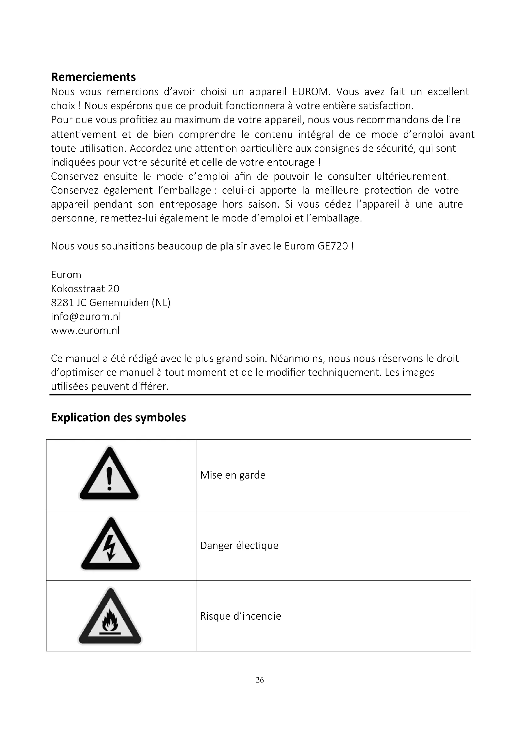 Remerciements Nous vous remercions d’avoir choisi un appareil EUROM. Vous avez fait un excellent choix ! Nous espérons que ce produit fonctionnera à votre entière satisfaction. Pour que vous profitiez au maximum de votre appareil, nous vous recommandons de lire attentivement et de bien comprendre le contenu intégral de ce mode d’emploi avant toute utilisation. Accordez une attention particulière aux consignes de sécurité, qui sont indiquées pour votre sécurité et celle de votre entourage ! Conservez ensuite le mode d’emploi afin de pouvoir le consulter ultérieurement. Conservez également l’emballage : celui-ci apporte la meilleure protection de votre appareil pendant son entreposage hors saison. Si vous cédez l’appareil à une autre personne, remettez-lui également le mode d’emploi et l’emballage. Nous vous souhaitions beaucoup de plaisir avec le Eurom GE720 ! Eurom Kokosstraat 20 8281 JC Genemuiden (NL) info@eurom.nl www.eurom.nl Ce manuel a été rédigé avec le plus grand soin. Néanmoins, nous nous réservons le droit d’optimiser ce manuel à tout moment et de le modifier techniquement. Les images utilisées peuvent différer. Explication des symboles