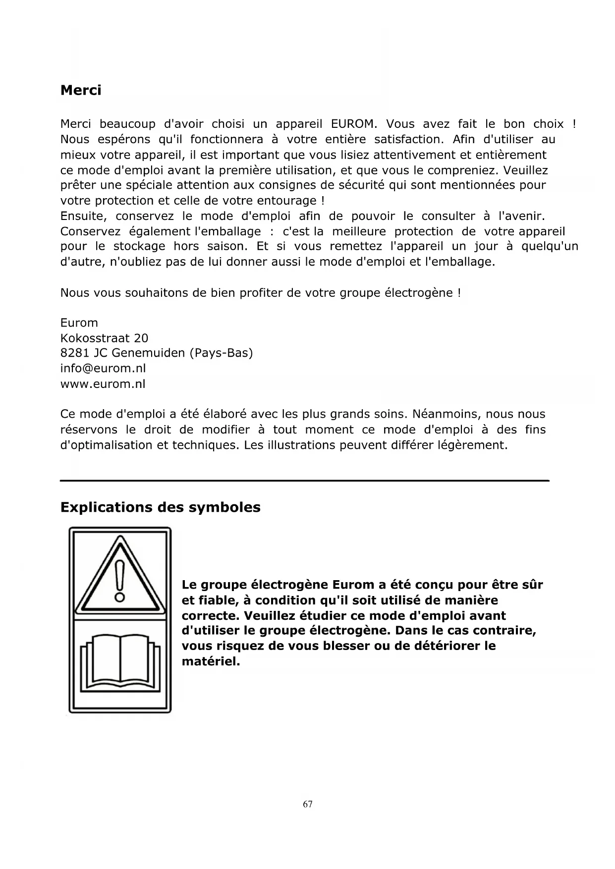 Le groupe électrogène Eurom a été conçu pour être sûr et fiable, à condition qu'il soit utilisé de manière correcte. Veuillez étudier ce mode d'emploi avant d'utiliser le groupe électrogène. Dans le cas contraire, vous risquez de vous blesser ou de détériorer le matériel.68