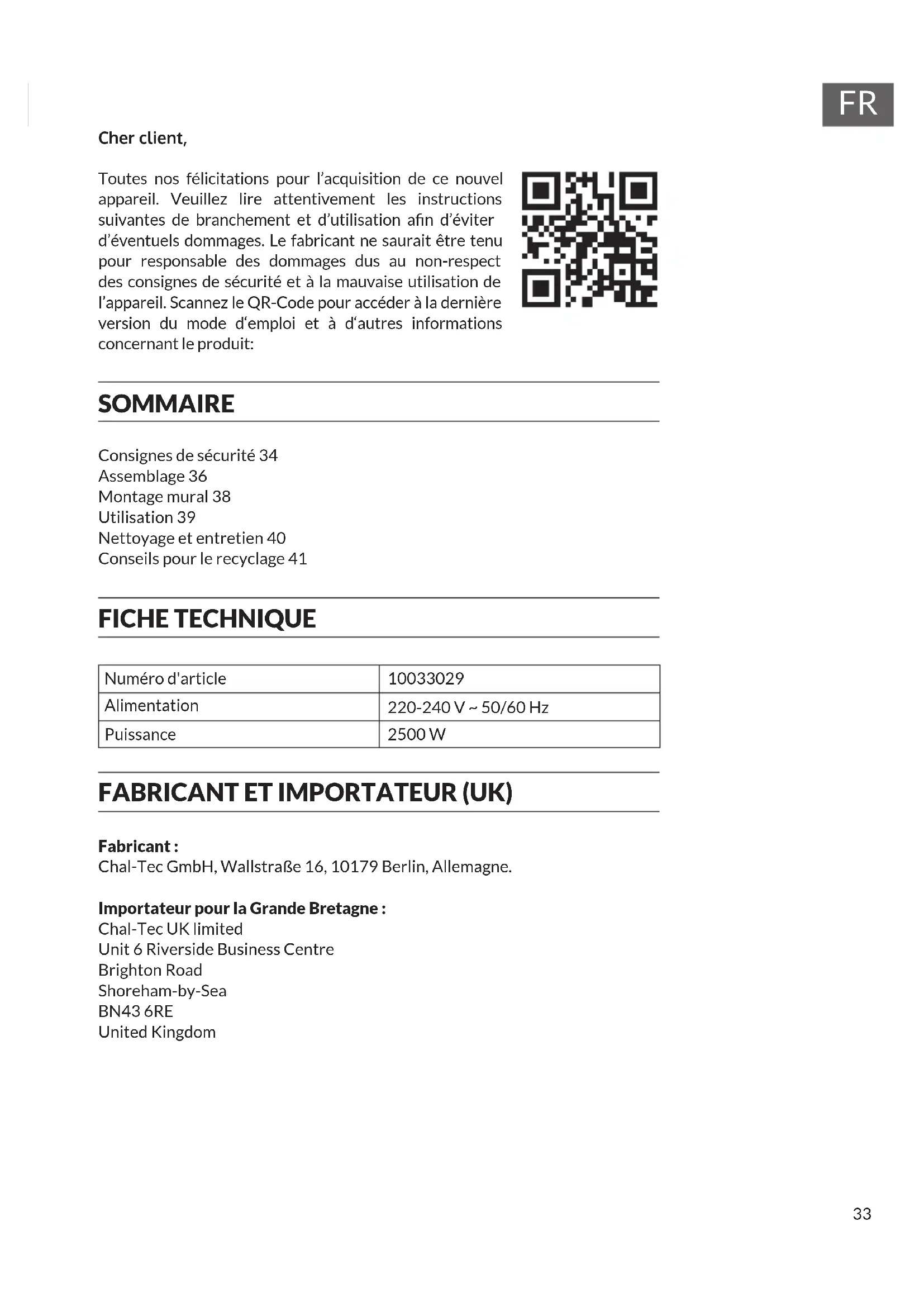 Cher client, Toutes nos félicitations pour l’acquisition de ce nouvel appareil. Veuillez lire attentivement les instructions suivantes de branchement et d’utilisation an d’éviter d’éventuels dommages. Le fabricant ne saurait être tenu pour responsable des dommages dus au non-respect des consignes de sécurité et à la mauvaise utilisation de l’appareil. Scannez le QR-Code pour accéder à la dernière version du mode d‘emploi et à d‘autres informations concernant le produit: SOMMAIRE Consignes de sécurité 34 Assemblage 36 Montage mural 38 Utilisation 39 Nettoyage et entretien 40 Conseils pour le recyclage 41 FICHE TECHNIQUE Numéro d'article