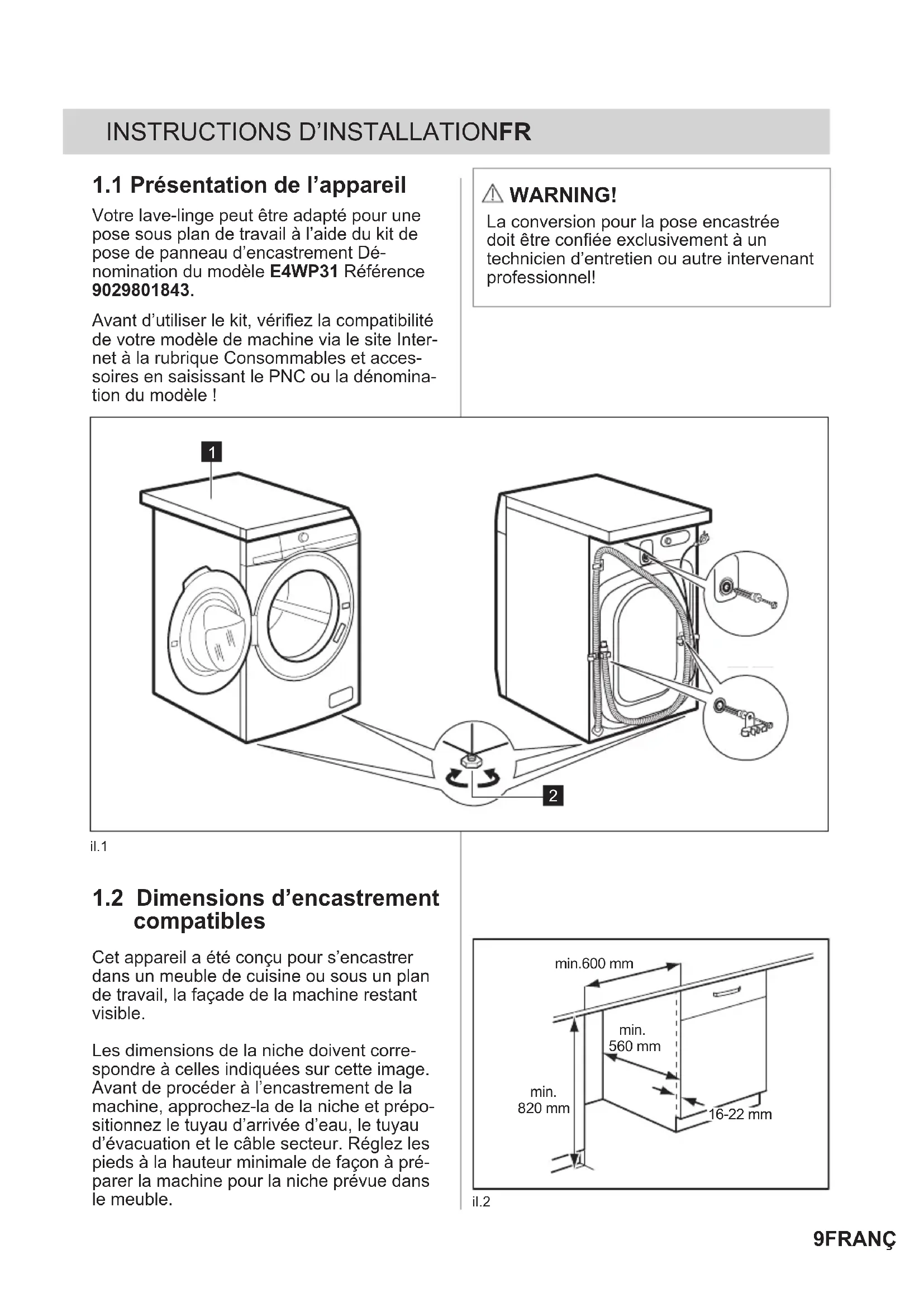 compatibles Cet appareil a été conçu pour s’encastrer dans un meuble de cuisine ou sous un plan de travail, la façade de la machine restant visible. Les dimensions de la niche doivent corre- spondre à celles indiquées sur cette image. Avant de procéder à l’encastrement de la machine, approchez-la de la niche et prépo- sitionnez le tuyau d’arrivée d’eau, le tuyau d’évacuation et le câble secteur. Réglez les pieds à la hauteur minimale de façon à pré- parer la machine pour la niche prévue dans le meuble. Avant d’utiliser le kit, vériez la compatibilité de votre modèle de machine via le site Inter- net à la rubrique Consommables et acces- soires en saisissant le PNC ou la dénomina- tion du modèle ! il.1 600 mm min. 820 mm min. min. 560 mm16-22 mm il.210 FRANÇAIS WARNING! Assurez-vous que les tuyaux et le câble secteur ne sont pas pliés ou écrasés. Veillez à ce que le plancher ne soit pas ir- régulier à l’intérieur de la niche!