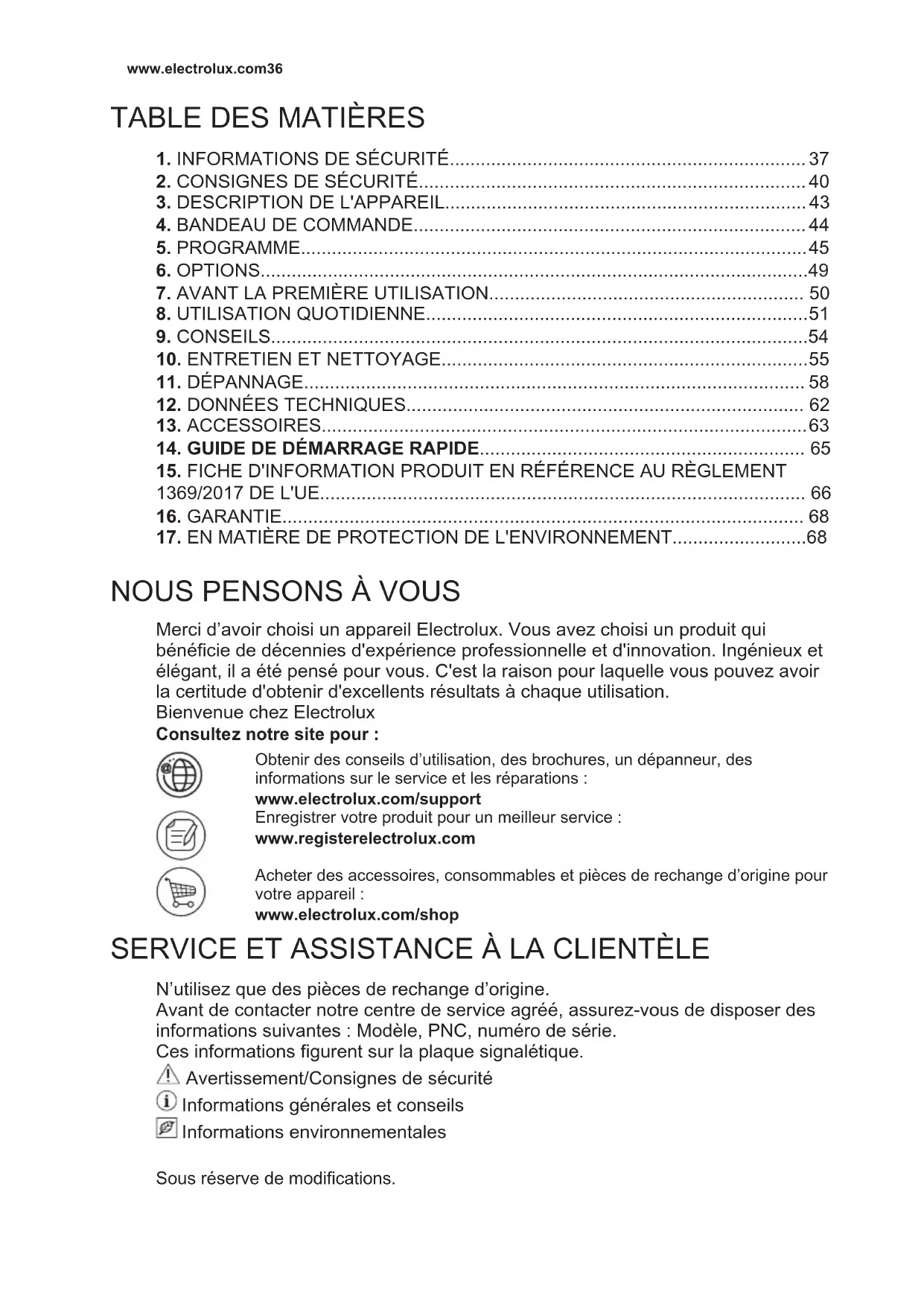 Merci d’avoir choisi un appareil Electrolux. Vous avez choisi un produit qui bénéficie de décennies d'expérience professionnelle et d'innovation. Ingénieux et élégant, il a été pensé pour vous. C'est la raison pour laquelle vous pouvez avoir la certitude d'obtenir d'excellents résultats à chaque utilisation. Bienvenue chez Electrolux Consultez notre site pour : Obtenir des conseils d’utilisation, des brochures, un dépanneur, des informations sur le service et les réparations : www.electrolux.com/support Enregistrer votre produit pour un meilleur service : www.registerelectrolux.com Acheter des accessoires, consommables et pièces de rechange d’origine pour votre appareil : www.electrolux.com/shop