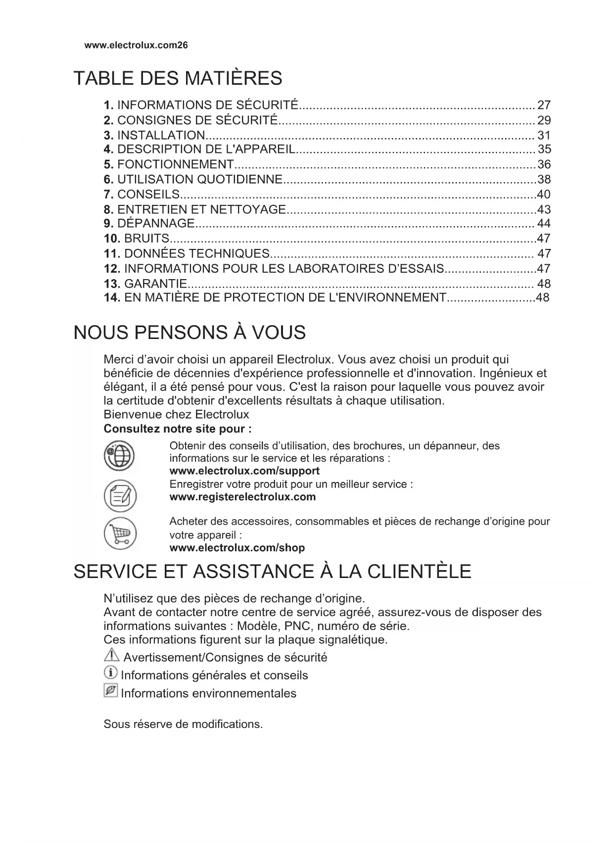 Merci d’avoir choisi un appareil Electrolux. Vous avez choisi un produit qui bénéficie de décennies d'expérience professionnelle et d'innovation. Ingénieux et élégant, il a été pensé pour vous. C'est la raison pour laquelle vous pouvez avoir la certitude d'obtenir d'excellents résultats à chaque utilisation. Bienvenue chez Electrolux Consultez notre site pour : Obtenir des conseils d’utilisation, des brochures, un dépanneur, des informations sur le service et les réparations : www.electrolux.com/support Enregistrer votre produit pour un meilleur service : www.registerelectrolux.com Acheter des accessoires, consommables et pièces de rechange d’origine pour votre appareil : www.electrolux.com/shop
