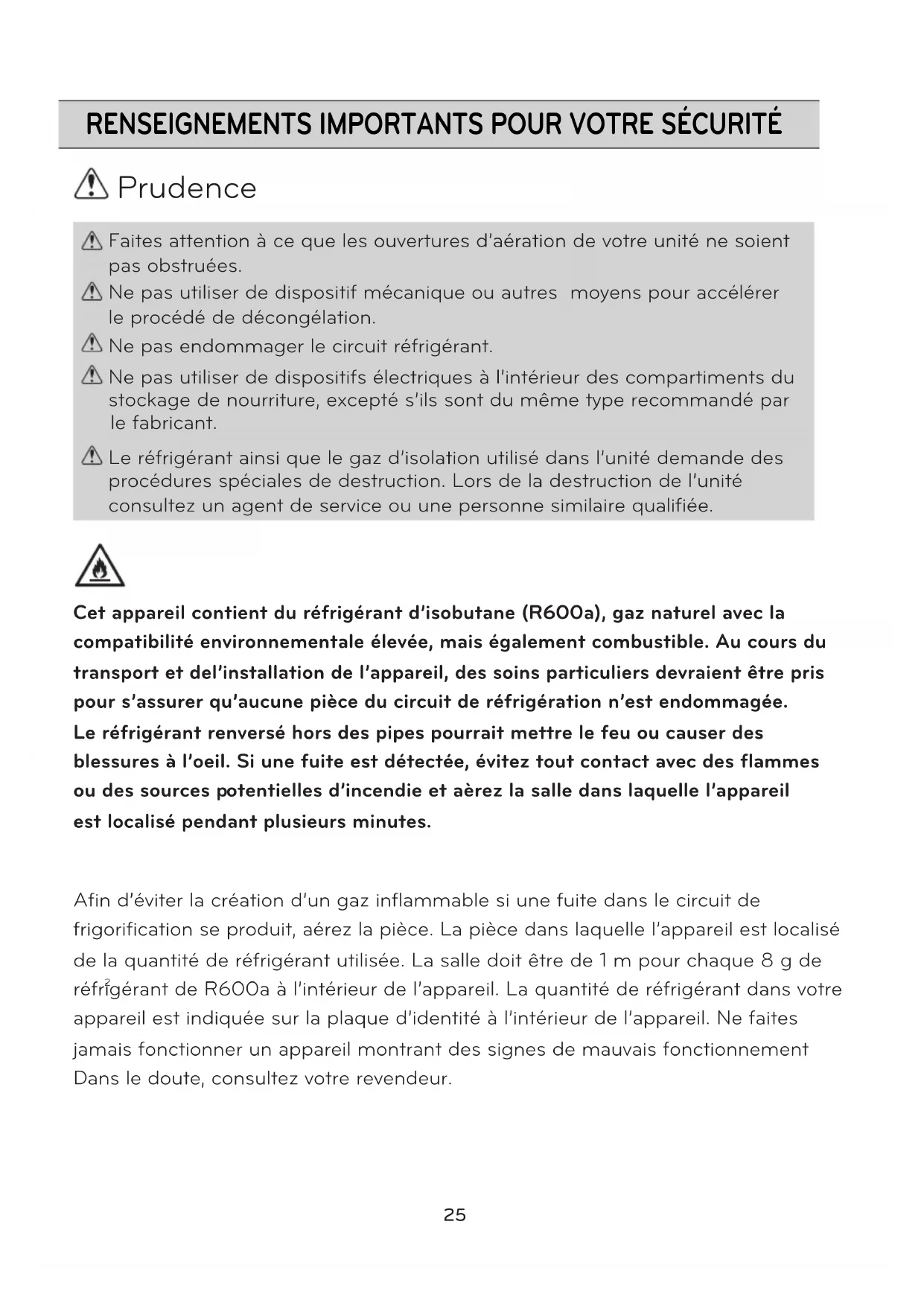 réfrigérant de R600a à l’intérieur de l’appareil. La quantité de réfrigérant dans votre appareil est indiquée sur la plaque d’identité à l’intérieur de l’appareil. Ne faites jamais fonctionner un appareil montrant des signes de mauvais fonctionnement Dans le doute, consultez votre revendeur. le fabricant. est localisé pendant plusieurs minutes. RENSEIGNEMENTS IMPORTANTS POUR VOTRE SÉCURITÉRENSEIGNEMENTS IMPORTANTS POUR VOTRE SÉCURITÉ