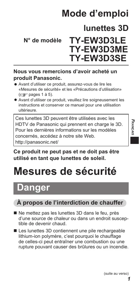 Mode d’emploi lunettes 3D N° de modèle