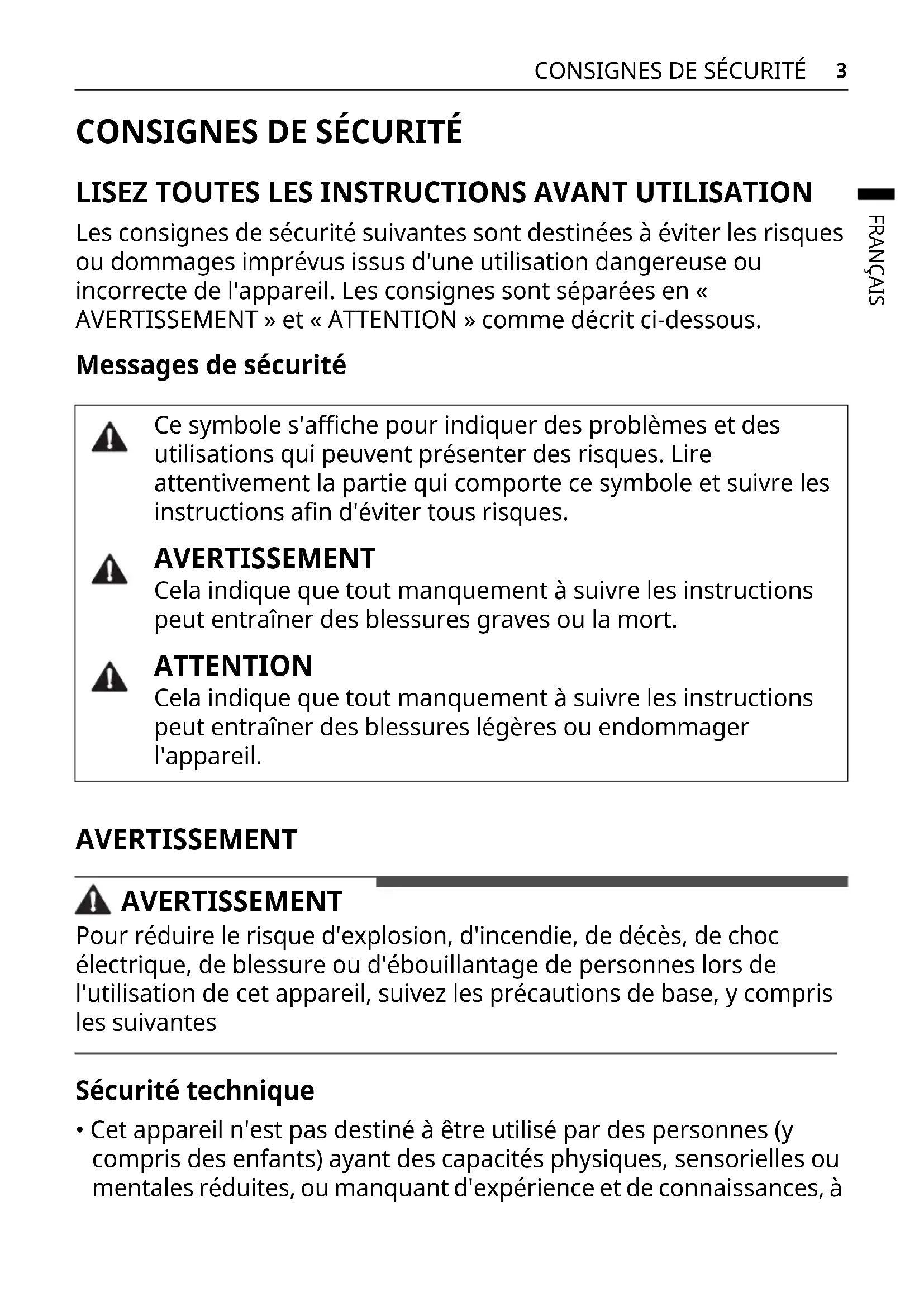 Les consignes de sécurité suivantes sont destinées à éviter les risques ou dommages imprévus issus d'une utilisation dangereuse ou incorrecte de l'appareil. Les consignes sont séparées en « AVERTISSEMENT » et « ATTENTION » comme décrit ci-dessous. Messages de sécurité AVERTISSEMENT AVERTISSEMENT Pour réduire le risque d'explosion, d'incendie, de décès, de choc électrique, de blessure ou d'ébouillantage de personnes lors de l'utilisation de cet appareil, suivez les précautions de base, y compris les suivantes Sécurité technique