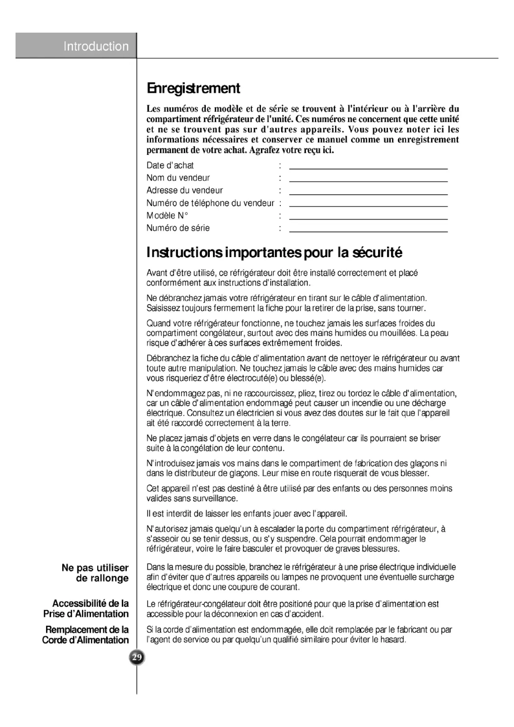 Risque d'enfermementd'unenfant.Avantde jeter votrevieux refrigerateur congelateur: Enlevezlesportesmaislaissezles etageres place afin d'empecher desenfantsdese glisser facilemental'interieur.Cet appareil n'estpasdestineaetreutilisepardesenfantsoudespersonnesmoinsvalidessanssurveillance. estinterditdelaisserlesenfants jouer avec l'appareil. Neconservezoun'utilisezpasdel'essenceoud'autres produits inflammables (liquides gazeux) proximite decet appareil oud'autres appareils.