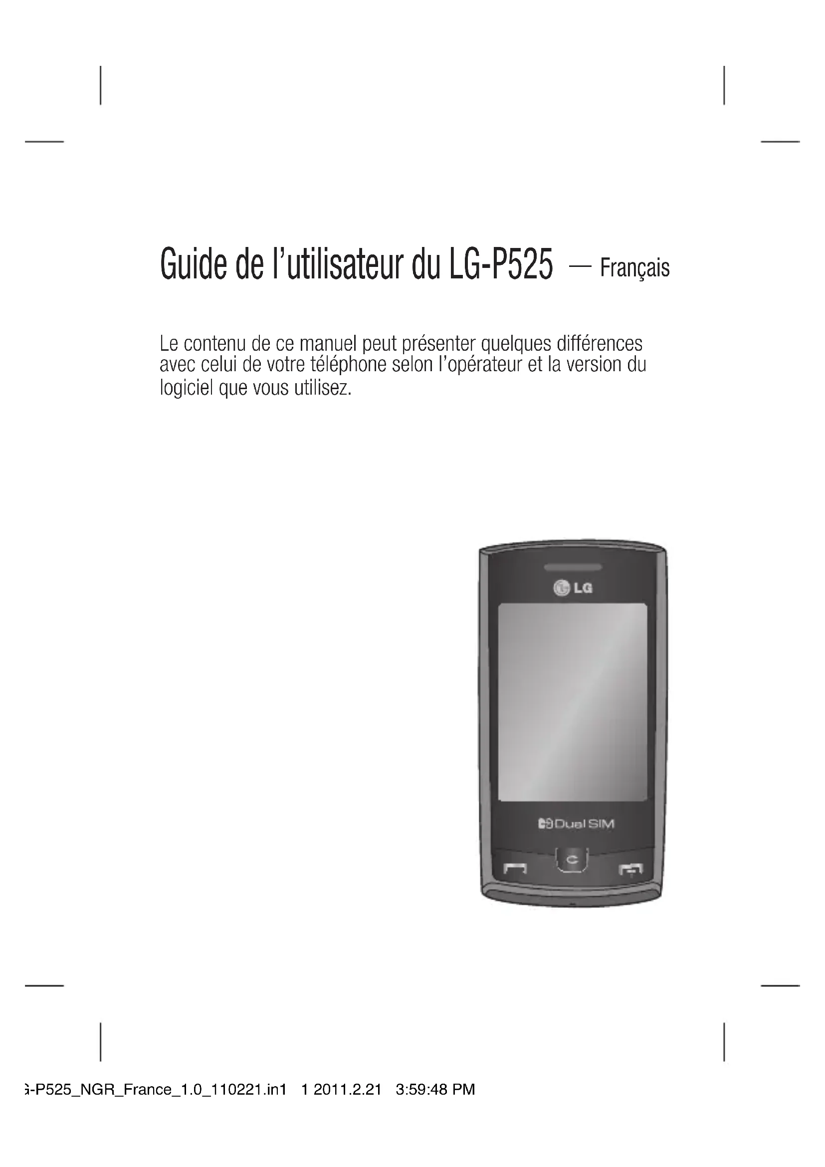 - Utilisez un kit mains libres, siUtilisez un kit mains libres, si disponible. LG-P525_NGR_France_1.0_110221.in5 5 2011.2.21 3:59:49 PM6