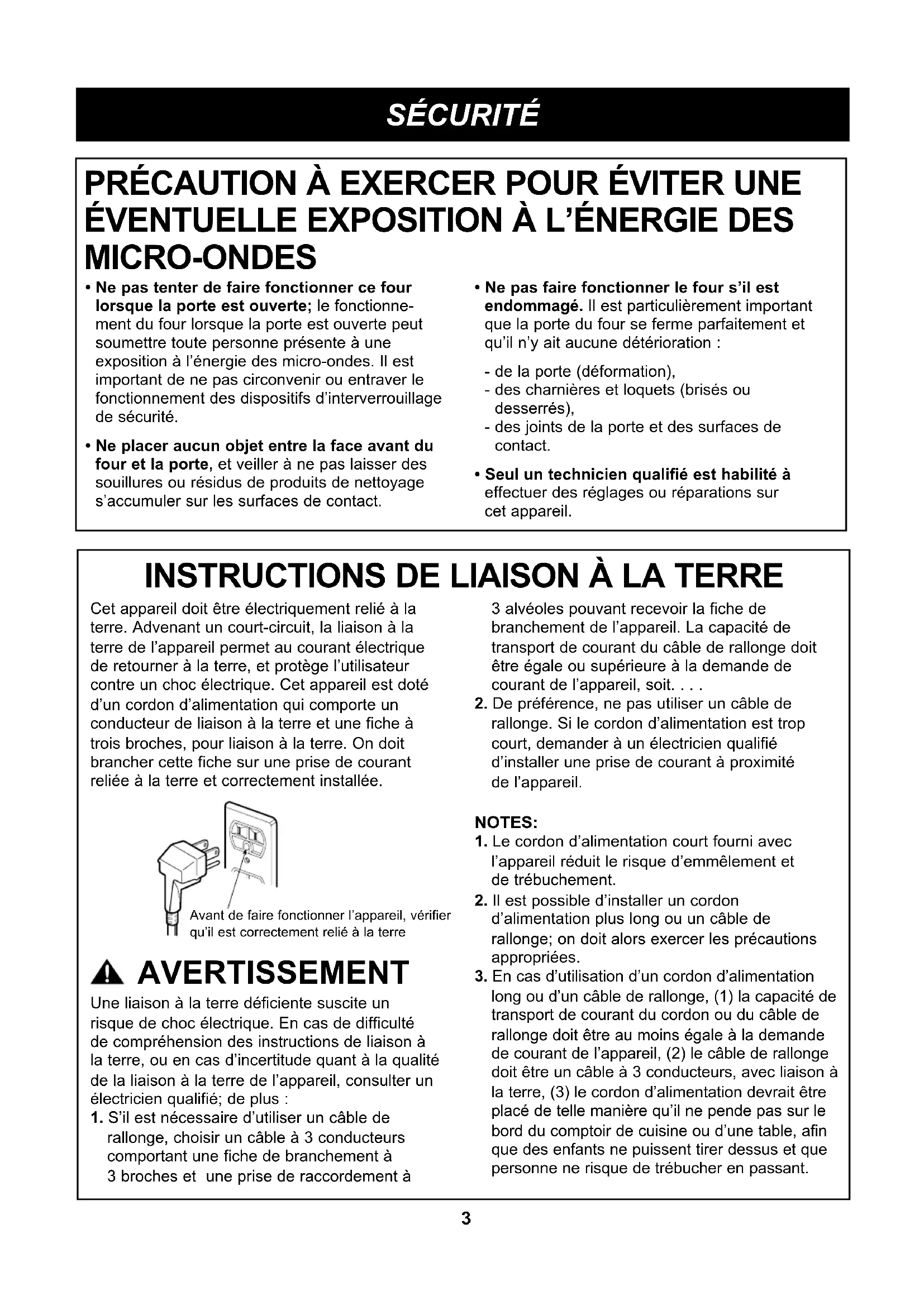 la terre. Voir les INSTRUCTIONS DE LIAISON À LA TERRE, à la page 3 de ce manuel.