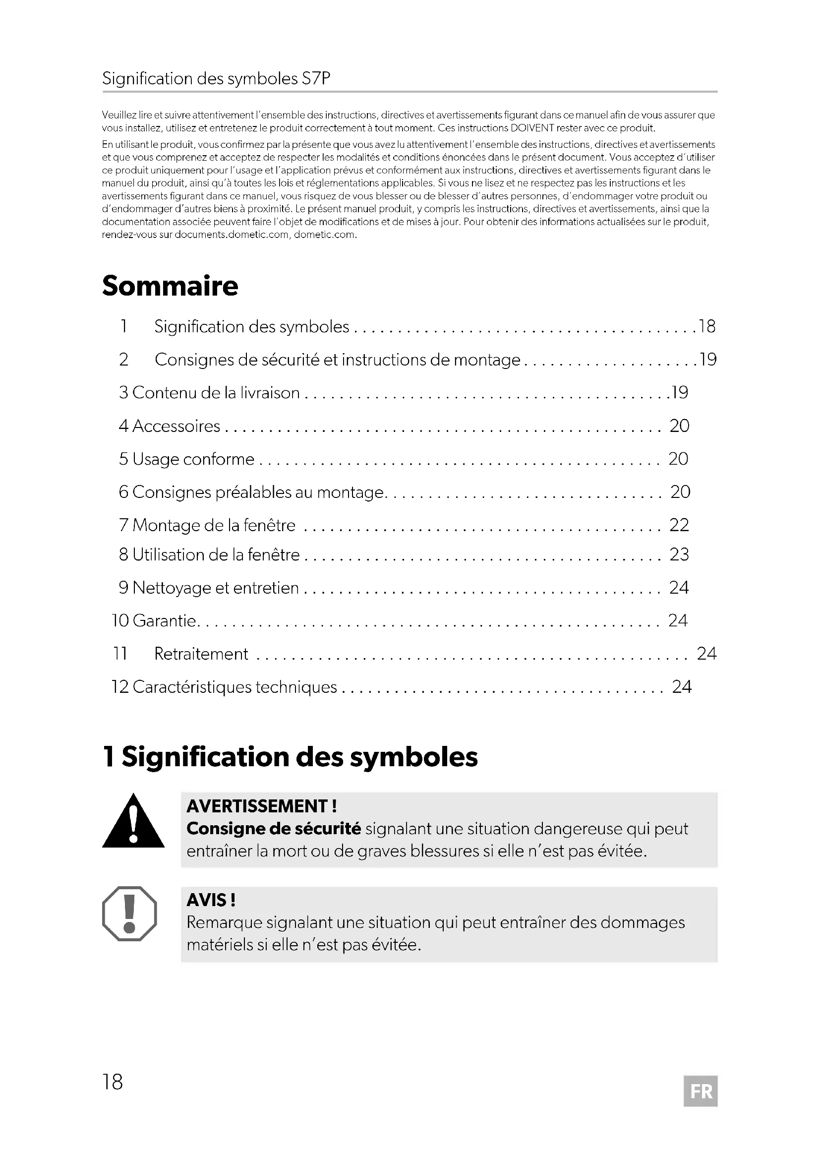 AVERTISSEMENT ! Consigne de sécurité signalant une situation dangereuse qui peut entraîner la mort ou de graves blessures si elle n’est pas évitée. AVIS ! Remarque signalant une situation qui peut entraîner des dommages matériels si elle n’est pas évitée. DometicS7P_IOM_4445101861_EMEA16_202x-xx-xx.book Page 18 Saturday, July 31, 2021 1:38 PMFR S7P Consignes de sécurité et instructions de montage