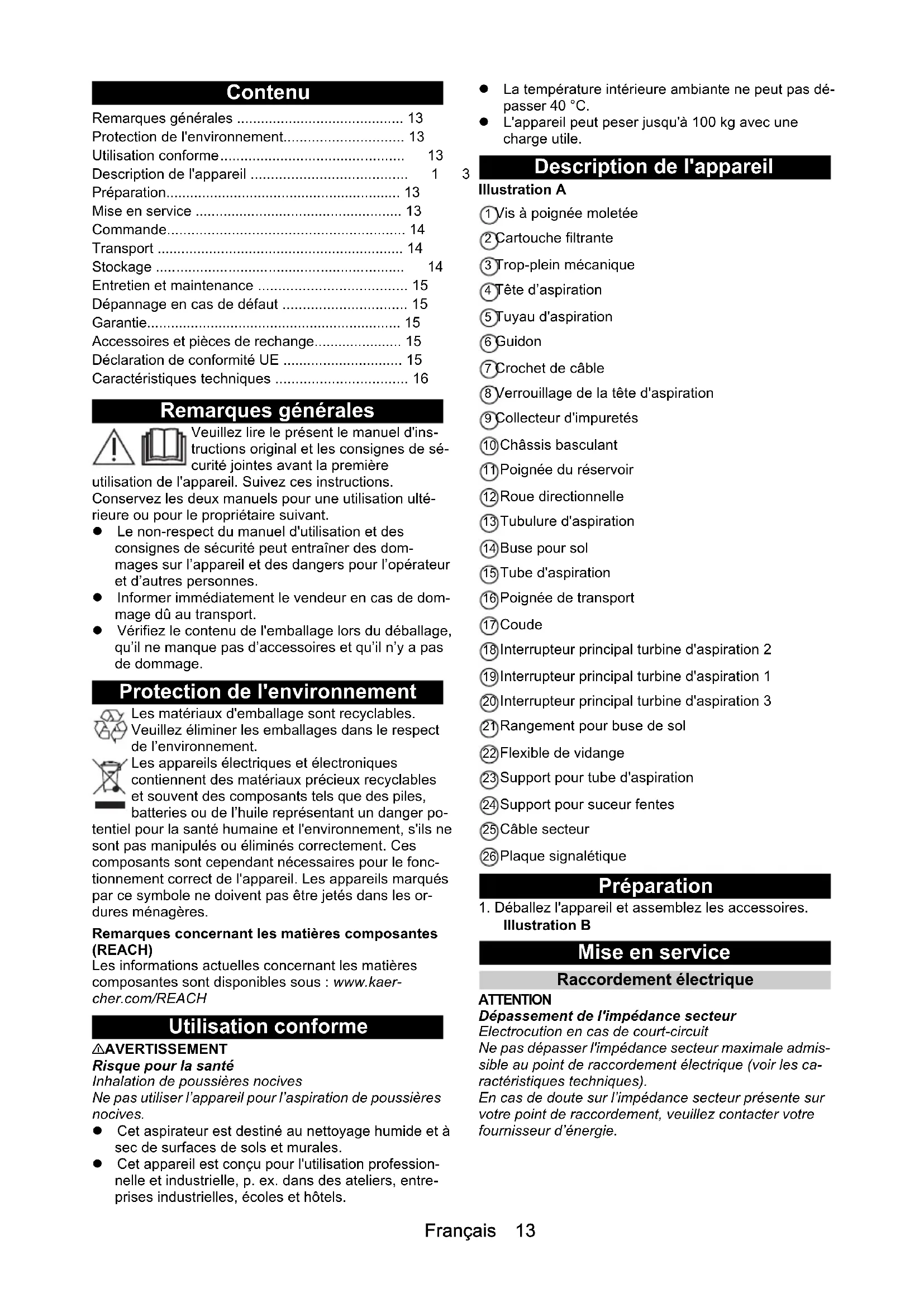 H05VV-F 2x1,5 H05VV-F 2x1,5 Part number (EU) 6.647-069.0 6.647-069.0 Cable length m 10 10Français 13 Contenu Remarques générales Veuillez lire le présent le manuel d'ins- tructions original et les consignes de sé- curité jointes avant la première utilisation de l'appareil. Suivez ces instructions. Conservez les deux manuels pour une utilisation ulté- rieure ou pour le propriétaire suivant. Le non-respect du manuel d'utilisation et des consignes de sécurité peut entraîner des dom- mages sur l’appareil et des dangers pour l’opérateur et d’autres personnes. Informer immédiatement le vendeur en cas de dom- mage dû au transport. Vérifiez le contenu de l'emballage lors du déballage, qu’il ne manque pas d’accessoires et qu’il n’y a pas de dommage. Protection de l'environnement Les matériaux d'emballage sont recyclables. Veuillez éliminer les emballages dans le respect de l’environnement. Les appareils électriques et électroniques contiennent des matériaux précieux recyclables et souvent des composants tels que des piles, batteries ou de l’huile représentant un danger po- tentiel pour la santé humaine et l'environnement, s'ils ne sont pas manipulés ou éliminés correctement. Ces composants sont cependant nécessaires pour le fonc- tionnement correct de l'appareil. Les appareils marqués par ce symbole ne doivent pas être jetés dans les or- dures ménagères. Remarques concernant les matières composantes (REACH) Les informations actuelles concernant les matières composantes sont disponibles sous : www.kaer- cher.com/REACH Utilisation conforme 몇 AVERTISSEMENT Risque pour la santé Inhalation de poussières nocives Ne pas utiliser l’appareil pour l’aspiration de poussières nocives. Cet aspirateur est destiné au nettoyage humide et à sec de surfaces de sols et murales. Cet appareil est conçu pour l'utilisation profession- nelle et industrielle, p. ex. dans des ateliers, entre- prises industrielles, écoles et hôtels. La température intérieure ambiante ne peut pas dé- passer 40 °C. L'appareil peut peser jusqu'à 100 kg avec une charge utile. Description de l'appareil Illustration A 1 Vis à poignée moletée 2 Cartouche filtrante 3 Trop-plein mécanique 4 Tête d’aspiration 5 Tuyau d'aspiration 6 Guidon 7 Crochet de câble 8 Verrouillage de la tête d'aspiration 9 Collecteur d'impuretés 10 Châssis basculant 11 Poignée du réservoir 12 Roue directionnelle 13 Tubulure d'aspiration 14 Buse pour sol 15 Tube d'aspiration 16 Poignée de transport 17 Coude 18 Interrupteur principal turbine d'aspiration 2 19 Interrupteur principal turbine d'aspiration 1 20 Interrupteur principal turbine d'aspiration 3 21 Rangement pour buse de sol 22 Flexible de vidange 23 Support pour tube d'aspiration 24 Support pour suceur fentes 25 Câble secteur 26 Plaque signalétique Préparation