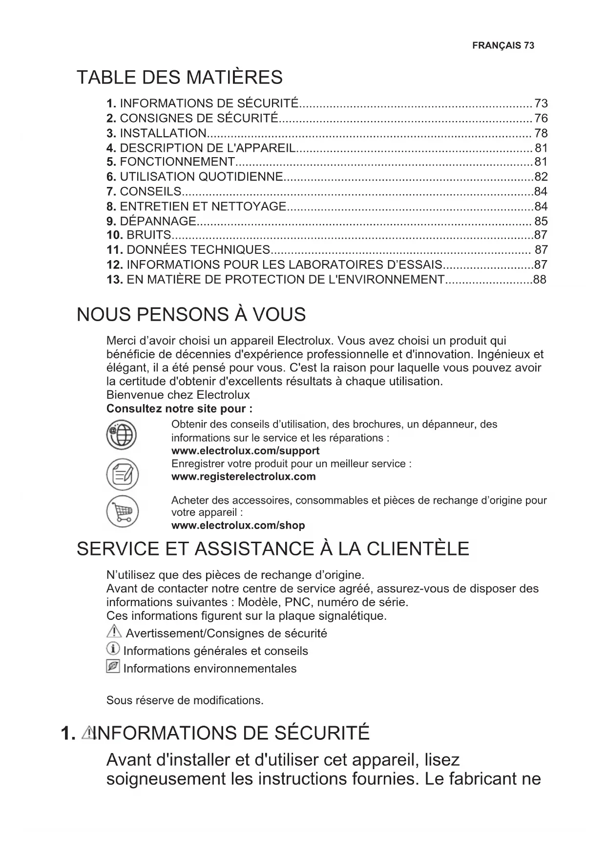 Merci d’avoir choisi un appareil Electrolux. Vous avez choisi un produit qui bénéficie de décennies d'expérience professionnelle et d'innovation. Ingénieux et élégant, il a été pensé pour vous. C'est la raison pour laquelle vous pouvez avoir la certitude d'obtenir d'excellents résultats à chaque utilisation. Bienvenue chez Electrolux Consultez notre site pour : Obtenir des conseils d’utilisation, des brochures, un dépanneur, des informations sur le service et les réparations : www.electrolux.com/support Enregistrer votre produit pour un meilleur service : www.registerelectrolux.com Acheter des accessoires, consommables et pièces de rechange d’origine pour votre appareil : www.electrolux.com/shop