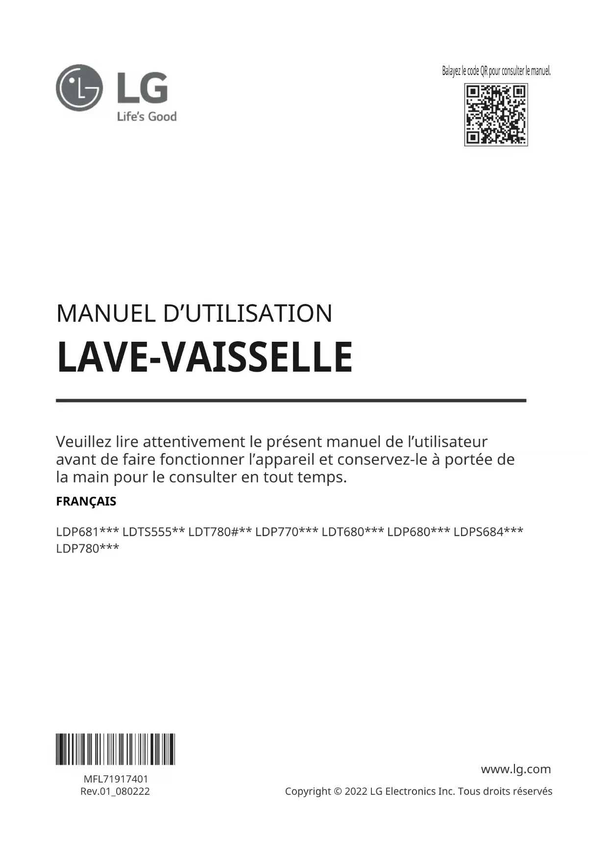 LAVE-VAISSELLE Veuillez lire attentivement le présent manuel de lʼutilisateur avant de faire fonctionner lʼappareil et conservez-le à portée de la main pour le consulter en tout temps. FRANÇAIS LDP681*** LDTS555** LDT780#** LDP770*** LDT680*** LDP680*** LDPS684*** LDP780*** MFL71917401Rev.01_080222 www.lg.com Copyright © 2022 LG Electronics Inc. Tous droits réservés Balayez le code QR pour consulter le manuel.TABLE DES MATIÈRES