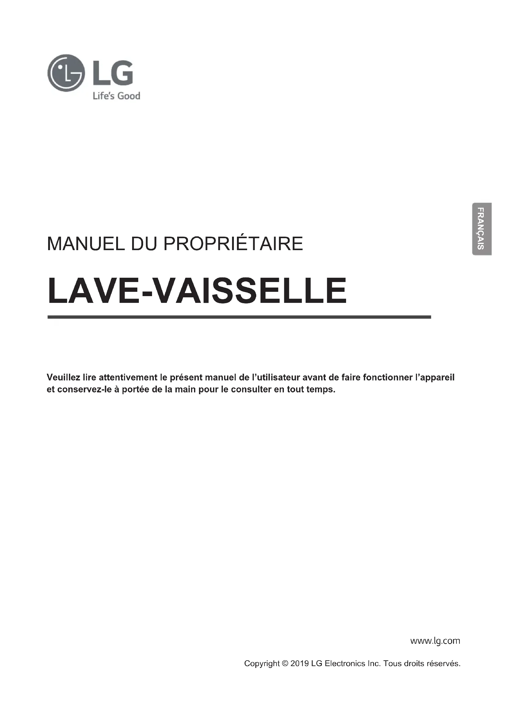 www.lg.com Copyright © 2019 LG Electronics Inc. Tous droits réservés. LAVE-VAISSELLE Veuillez lire attentivement le présent manuel de lʼutilisateur avant de faire fonctionner lʼappareil et conservez-le à portée de la main pour le consulter en tout temps.2