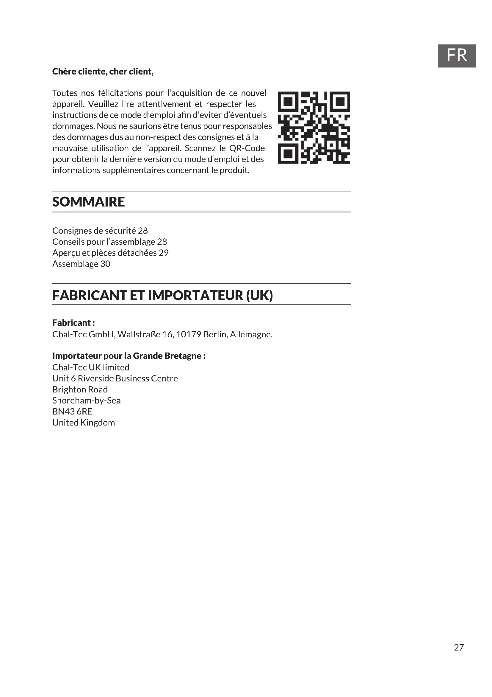 Chère cliente, cher client, Toutes nos félicitations pour l’acquisition de ce nouvel appareil. Veuillez lire attentivement et respecter les instructions de ce mode d’emploi an d’éviter d’éventuels dommages. Nous ne saurions être tenus pour responsables des dommages dus au non-respect des consignes et à la mauvaise utilisation de l’appareil. Scannez le QR-Code pour obtenir la dernière version du mode d‘emploi et des informations supplémentaires concernant le produit. SOMMAIRE Consignes de sécurité 28 Conseils pour l‘assemblage 28 Aperçu et pièces détachées 29 Assemblage 30 FABRICANT ET IMPORTATEUR (UK) Fabricant : Chal-Tec GmbH, Wallstraße 16, 10179 Berlin, Allemagne. Importateur pour la Grande Bretagne : Chal-Tec UK limited Unit 6 Riverside Business Centre Brighton Road Shoreham-by-Sea BN43 6RE United Kingdom28