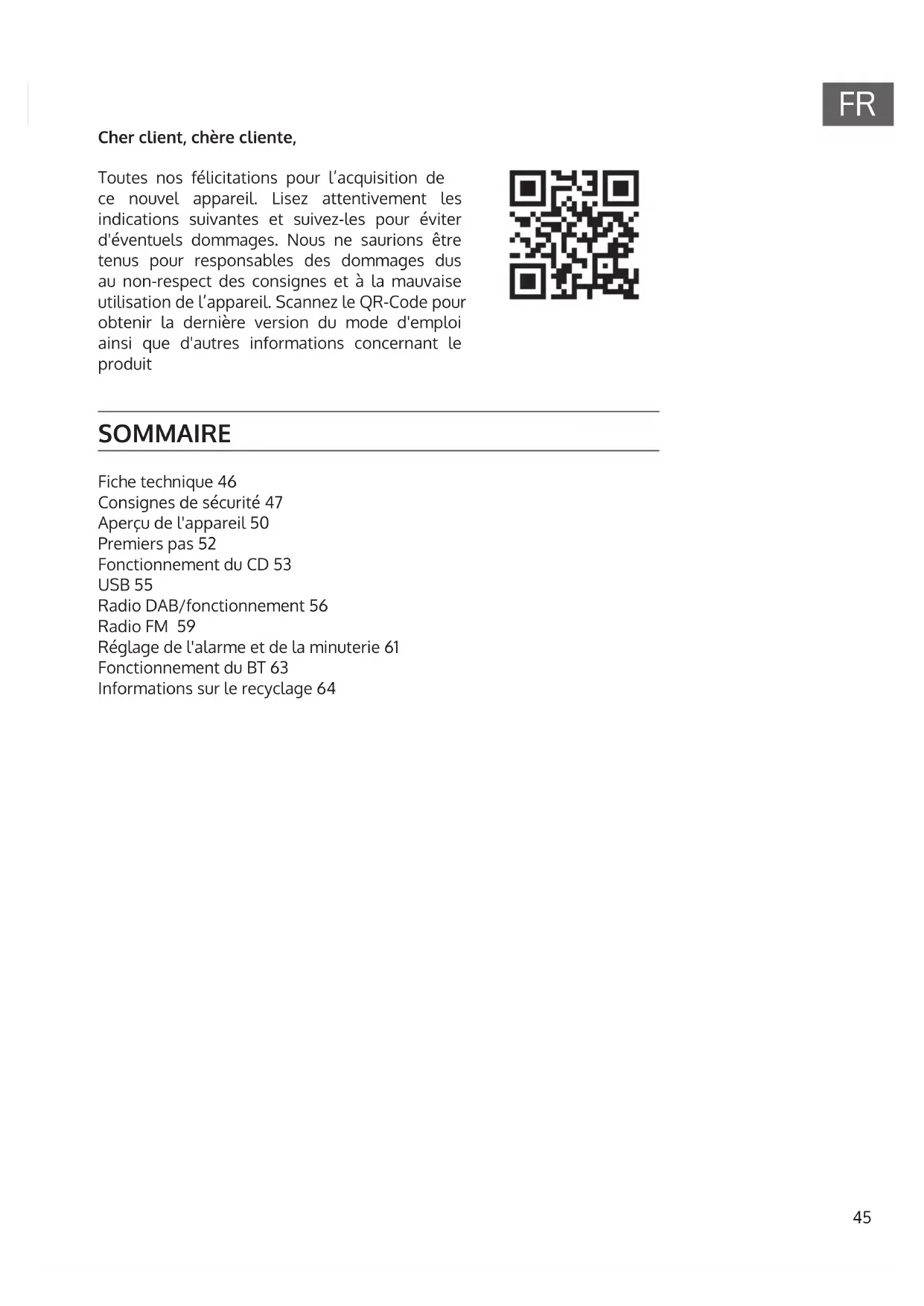 Fiche technique 46 Consignes de sécurité 47 Aperçu de l'appareil 50 Premiers pas 52 Fonctionnement du CD 53 USB 55 Radio DAB/fonctionnement 56 Radio FM 59 Réglage de l'alarme et de la minuterie 61 Fonctionnement du BT 63 Informations sur le recyclage 64 SOMMAIRE Cher client, chère cliente, Toutes nos félicitations pour l’acquisition de ce nouvel appareil. Lisez attentivement les indications suivantes et suivez-les pour éviter d'éventuels dommages. Nous ne saurions être tenus pour responsables des dommages dus au non-respect des consignes et à la mauvaise utilisation de l’appareil. Scannez le QR-Code pour obtenir la dernière version du mode d'emploi ainsi que d'autres informations concernant le produit46